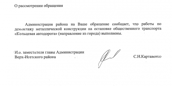 Номер жалобы:41953 Тип жалобы:Прочее Название объекта:Мэрия Регион:Свердловская область Город:Екатеринбург Адрес:Объездная дорога Описание жалобы:На посадочной площадке остановки «Кольцевая автодорога» в направлении Чусовского озера и Палкинского Торфяника размещён обрезок трубы. Статус: