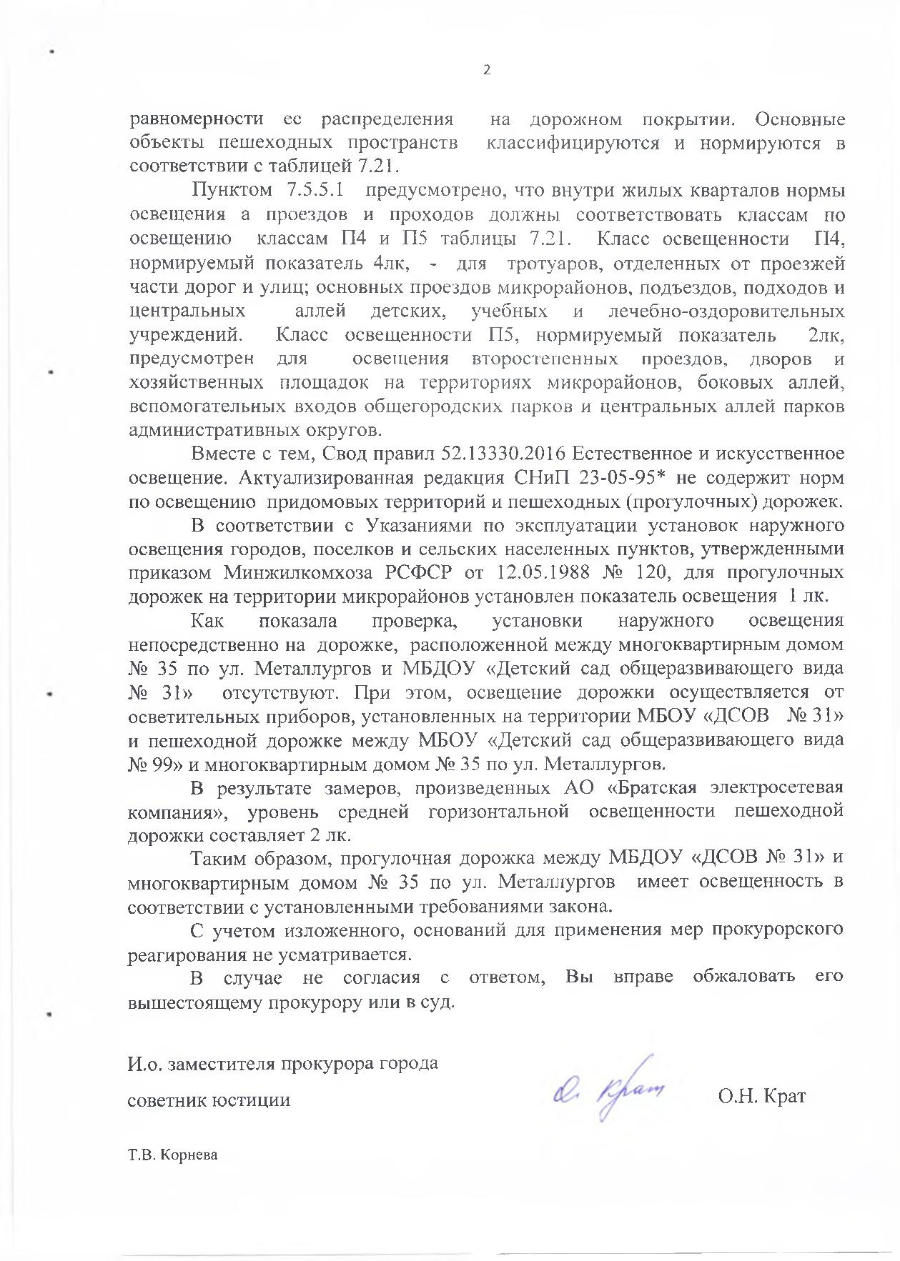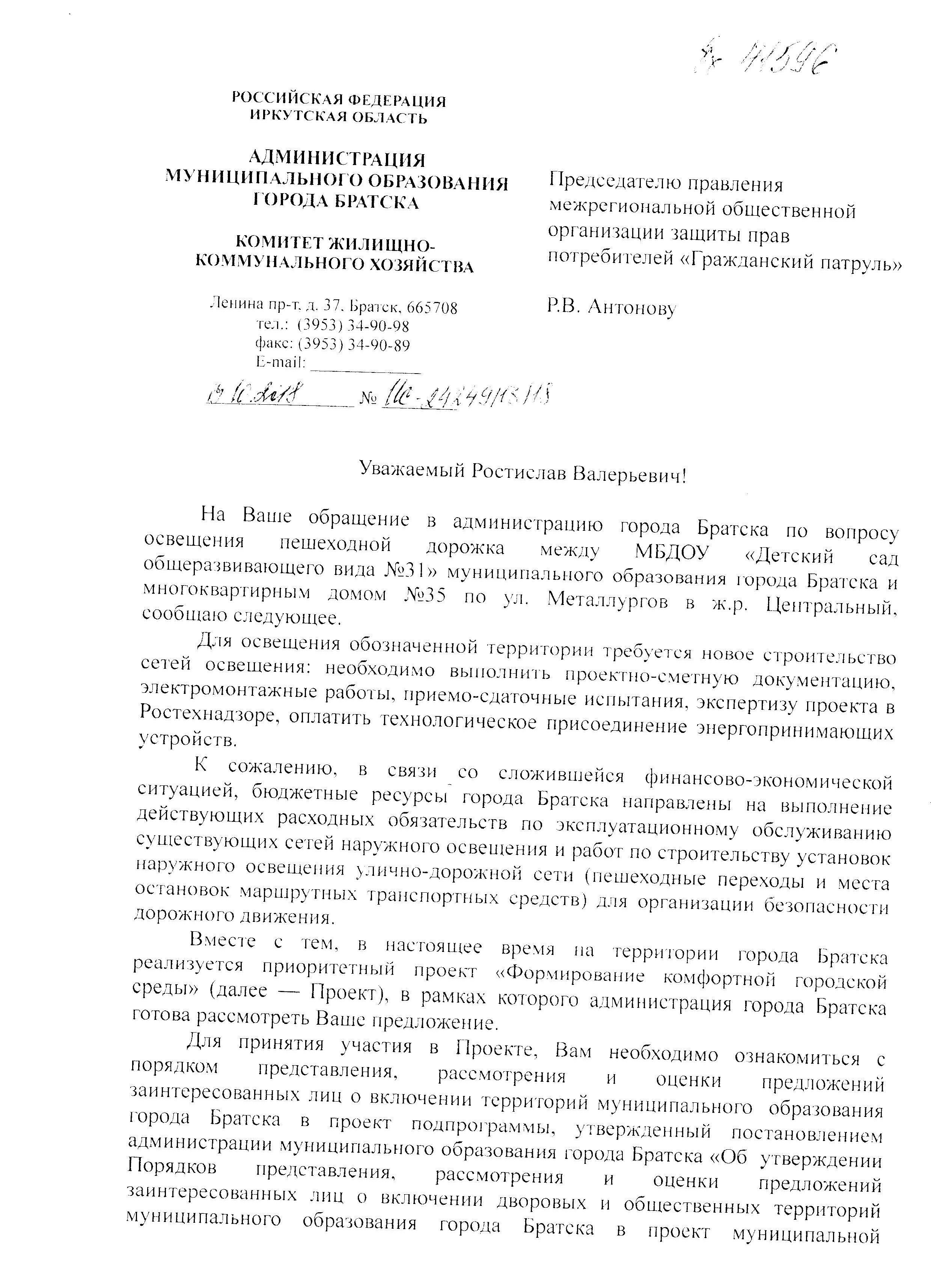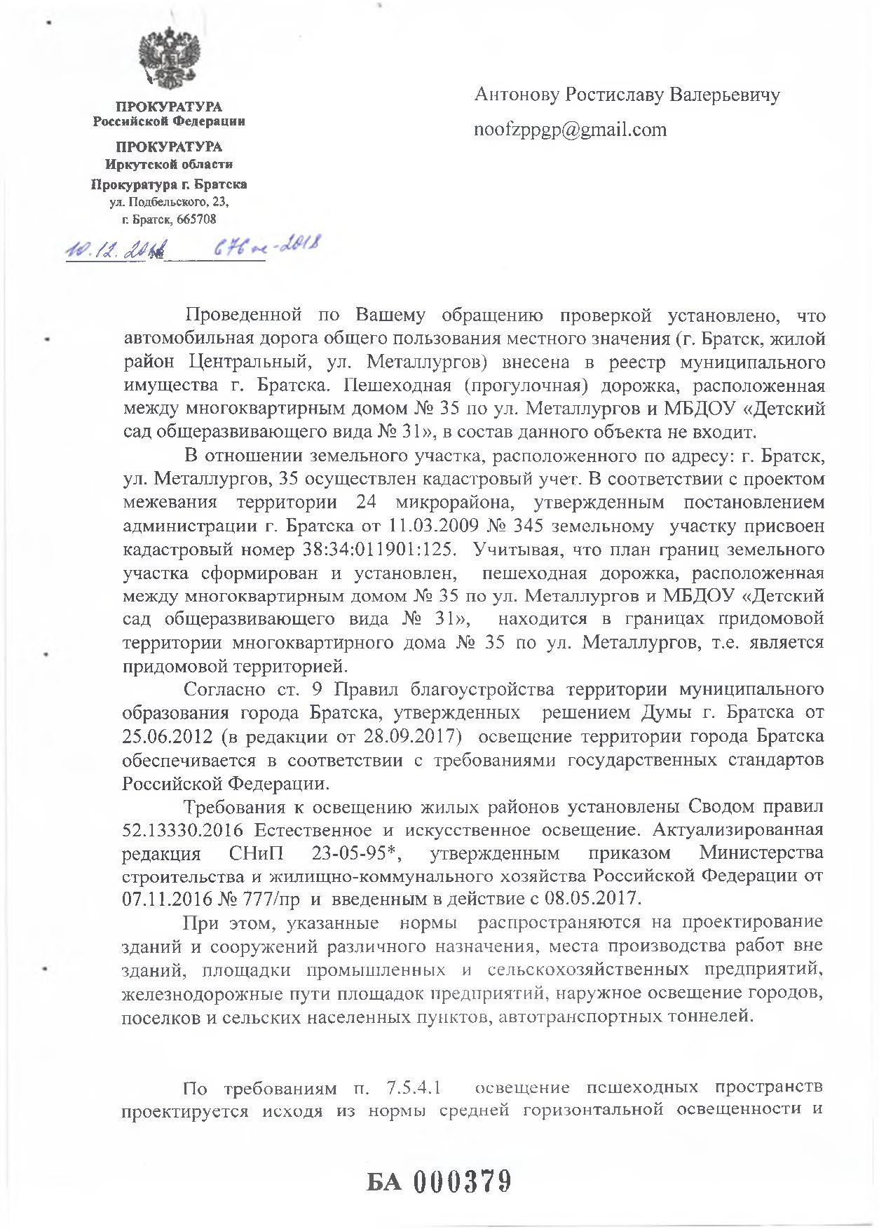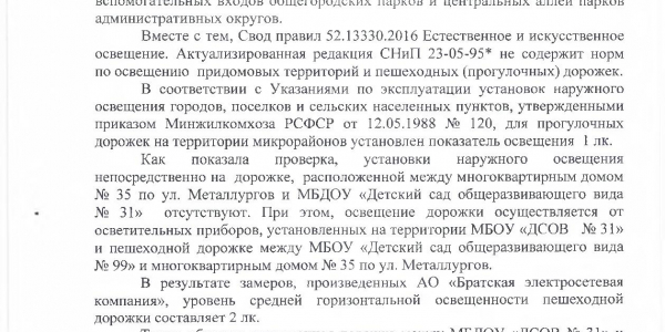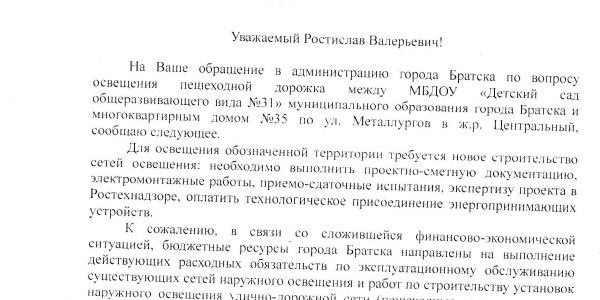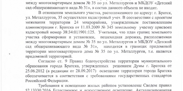 Номер жалобы:41596 Тип жалобы:Прочее Название объекта:Дорога Регион:Иркутская область Город:Братск Адрес:ул. Металлургов, 35 Описание жалобы:По адресу: Иркутская область, г.Братск, ул. Металлургов, 35 на дороге между ДОУ 31 и домом Металлургов, 35 есть дорога ведущая во двор. На ней отсутствует освещение. Это делает наиболее опасным данный участок дороги. Статус: