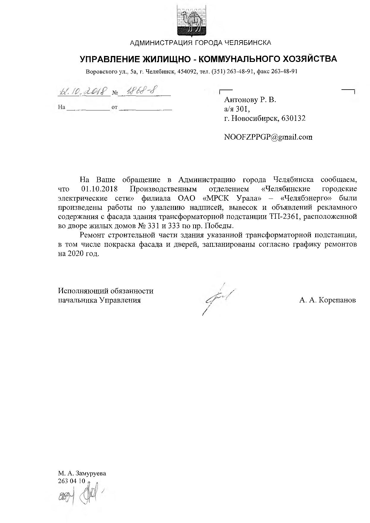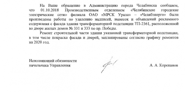 Номер жалобы:41649 Тип жалобы:Прочее Название объекта:Администрация Регион:Челябинская область Город:Челябинск Адрес:просп. Победы, 333 Описание жалобы:Собственник здания ТП-2361, расположенного во дворе домов проспект Победы 333 и 331, не следит за своим имуществом: весь фасад исписан неприличными надписями и обклеен объявлениями.