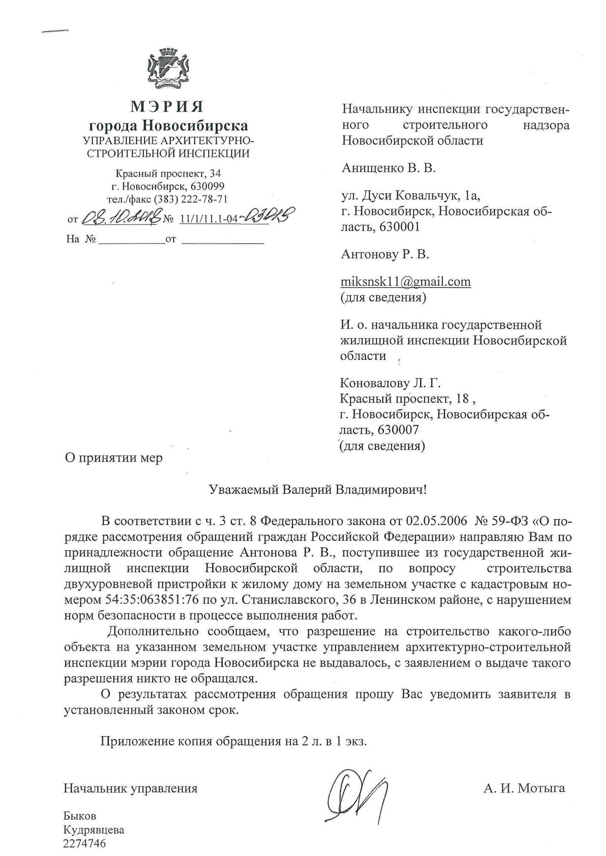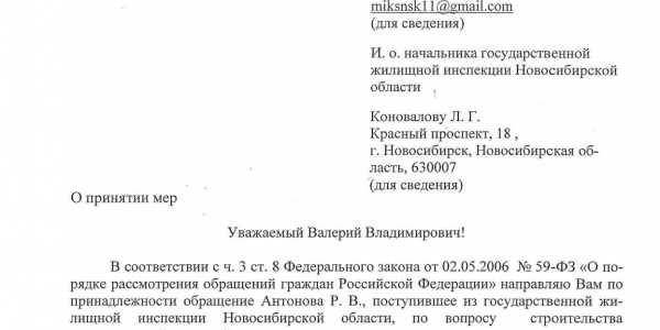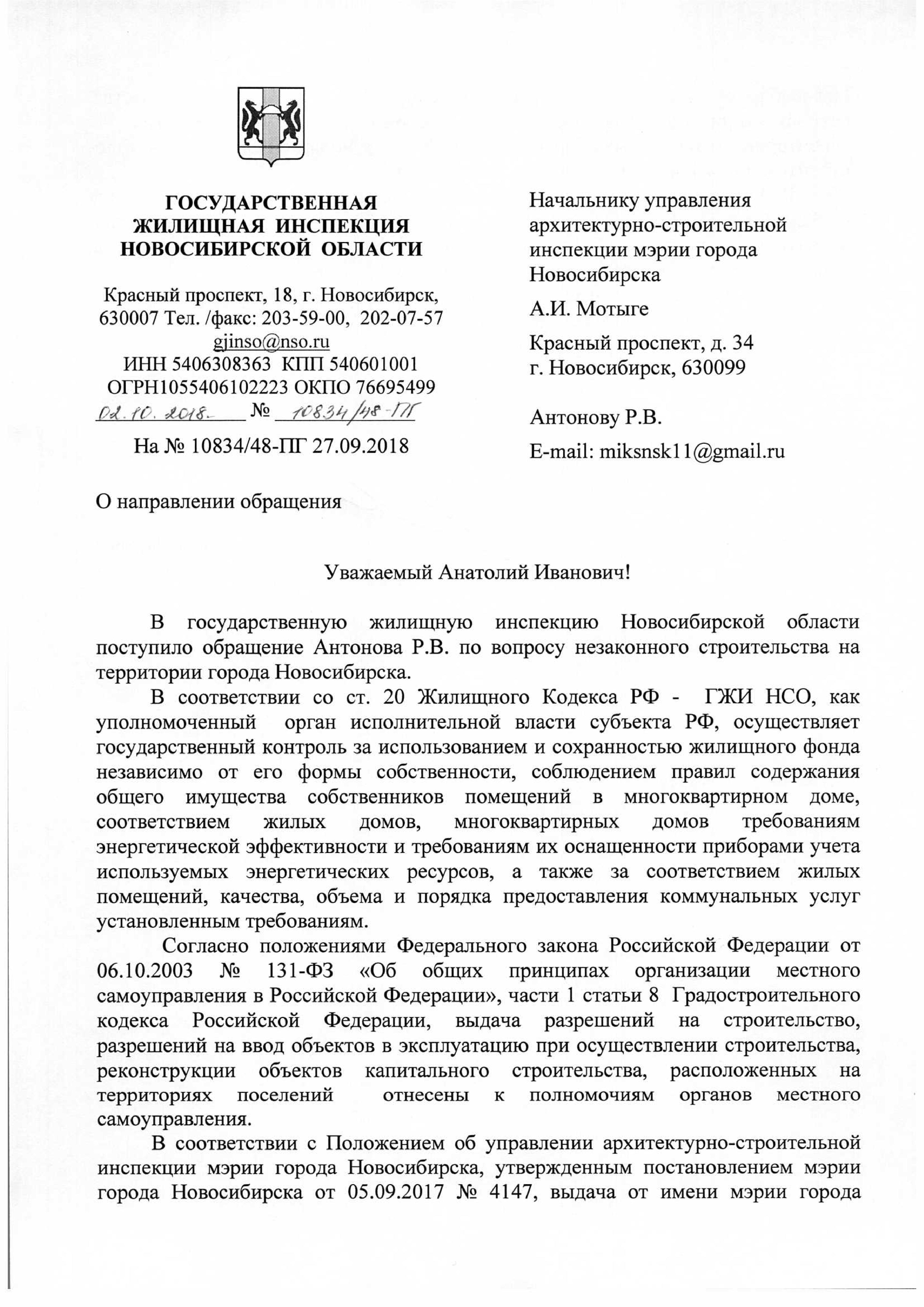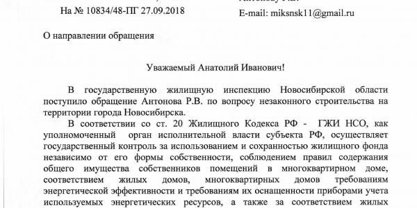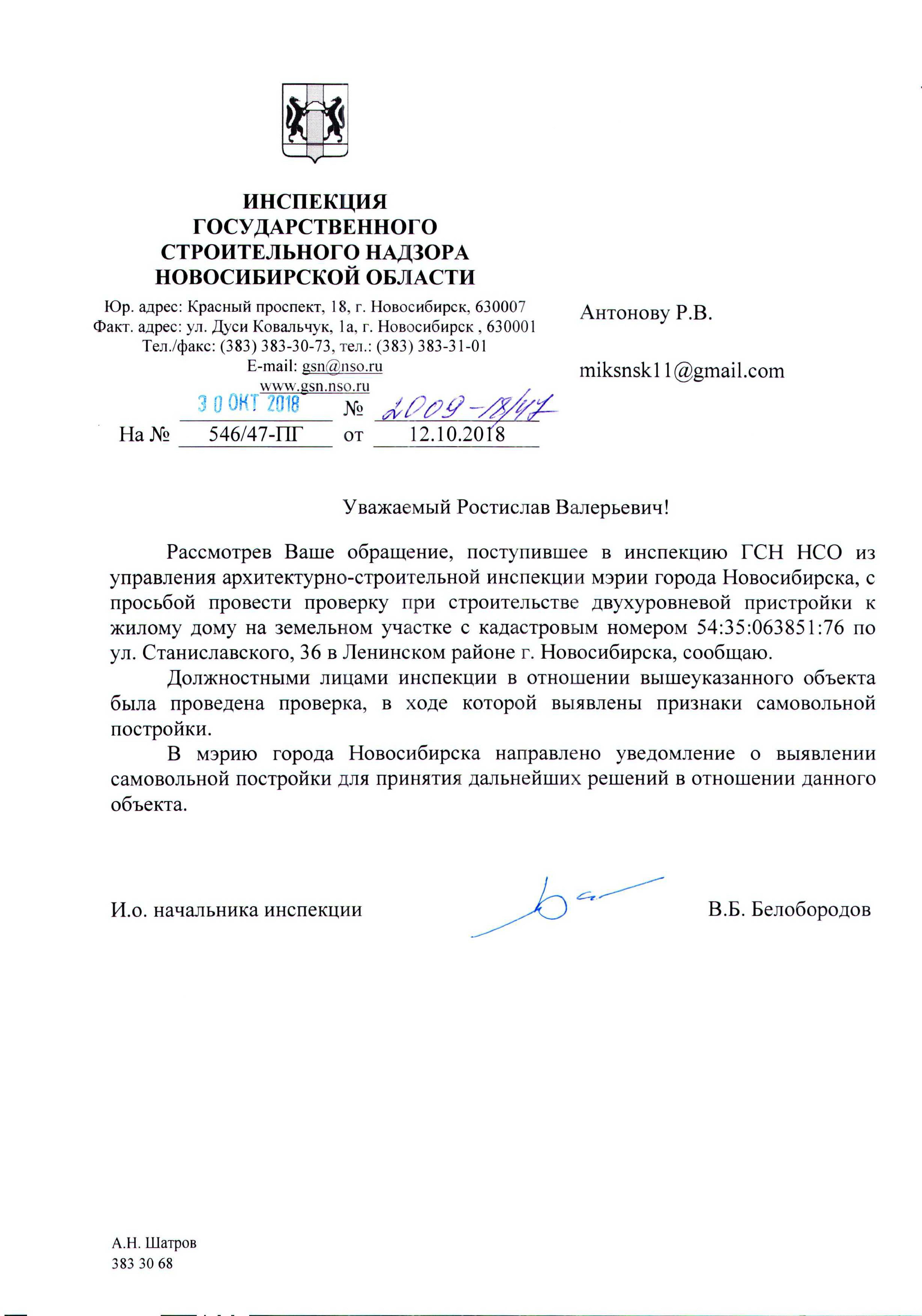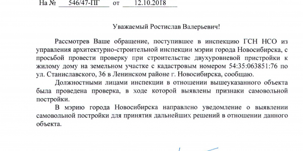 Номер жалобы:41712 Тип жалобы:Прочее Название объекта:Не Установлено Регион:Новосибирская область Город:Новосибирск Адрес:ул. Станиславского, 36 Описание жалобы:Незаконное строительство двухуровнего пристроя к дому станиславского 36. Нет паспорта объекта и согласия жильцов. Рабочие работают без страховки, без соблюдения норм безопасности при строительстве. Статус: