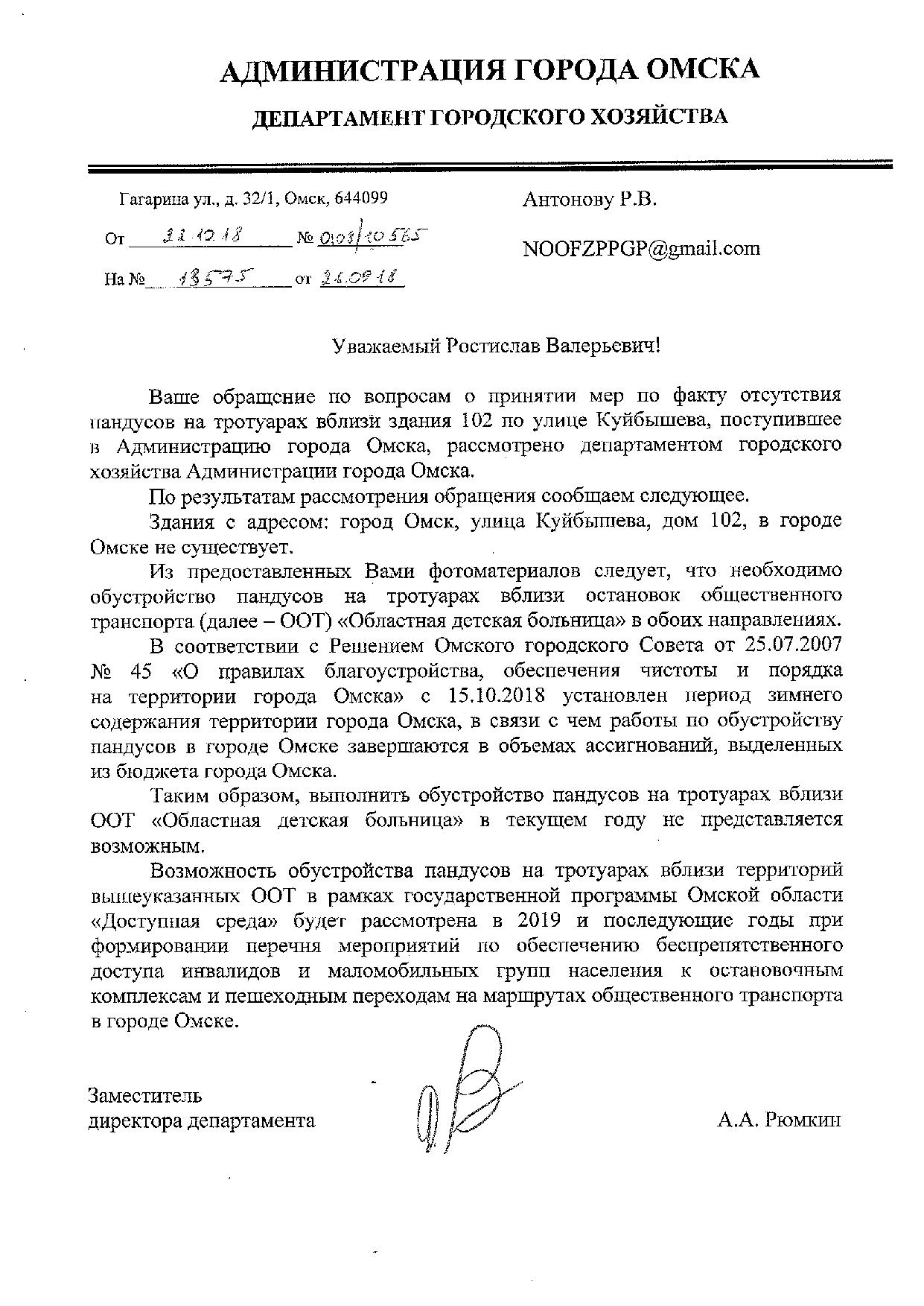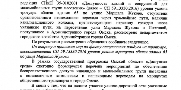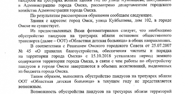 Номер жалобы:41715 Тип жалобы:Прочее Название объекта:? Регион:Омская Город:Омск Адрес:ул. Куйбышева, 102 Описание жалобы:Нет пандусов на тротуарах, которые пересекаются с улицей Успенского. Причем они находятся перед городской поликлиникой #12 пока доберешься до врача, последнее здоровье оставишь. Я не говорю о мамах с колясками. На 2 фото поликлиника Статус: