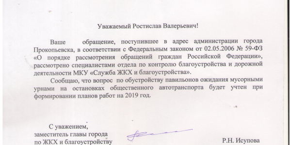 Номер жалобы:41609 Тип жалобы:Прочее Название объекта:9 Регион:Кемеровская область Город:Прокопьевск Адрес:Союзная улица Описание жалобы:Повтор жалобы - 38013. Необходима установка мусорного ведра на автобусной остановке Статус:
