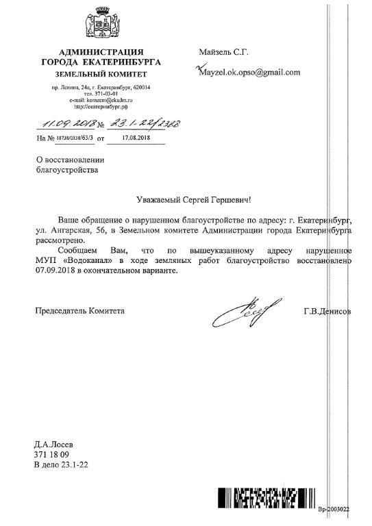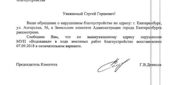 Номер жалобы:41475 Тип жалобы:Прочее Название объекта:Аварийная служба ВОДОКАНАЛА Регион:Свердловская область Город:Екатеринбург Адрес:Ангарская ул., 56 Описание жалобы:12.09.18 получила ответ пр жалобе 39867?в которой сказано,что все работы Водоканалом выполнены в полном объеме по восстановления дорожного покрытия по Ангарской 56!А на самом деле - это только отписка! В итоге работы до конца не слеланы:не заасфалтирован 1 участок и бордюры валяются на газоне!Прошу принять дальнейшие меры!Заранее благодарна! Фото пришлю отдельно (вечером) Статус: