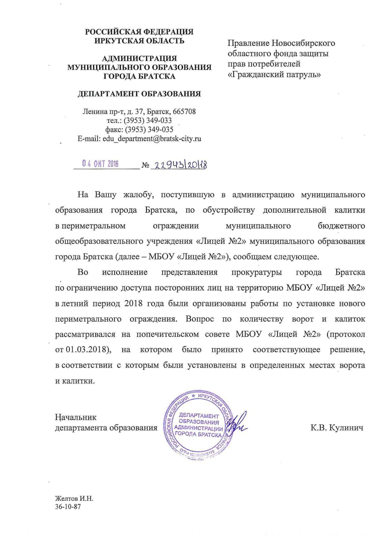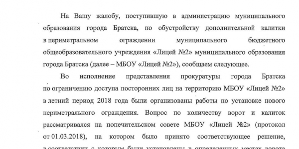Номер жалобы:41447 Тип жалобы:Прочее Название объекта:Лицей 2 Регион:Иркутская область Город:Братск Адрес:ул. Крупской, 29 Описание жалобы:По адресу: Иркутская область, г.Братск, ул. Крупской, 29 установлен забор ограждающий Лицей 2. Так же отсутствуют ворота в том месте где они раньше были а асвальтовая дорога до бывших ворот есть. Прошу вернуть ворота так как они уорощают передвижение по территории а их отсутствие заставляет обходить территорию лицея 2. Статус:
