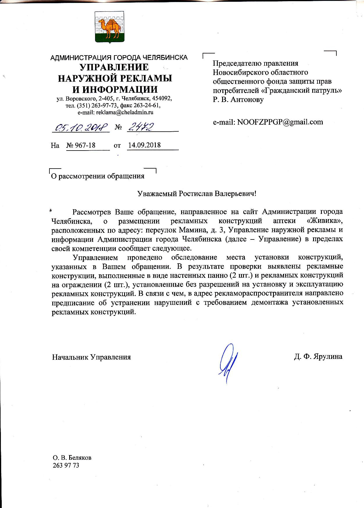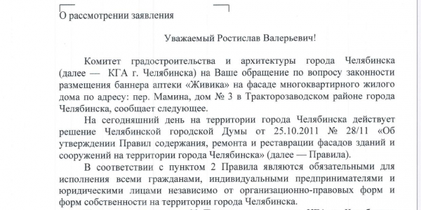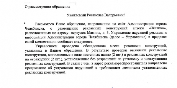 Номер жалобы:41460 Тип жалобы:Прочее Название объекта:Аптека "Живика" Регион:Челябинская область Город:Челябинск Адрес:пер. Мамина, 3 Описание жалобы:Незаконная реклама аптеки Статус: