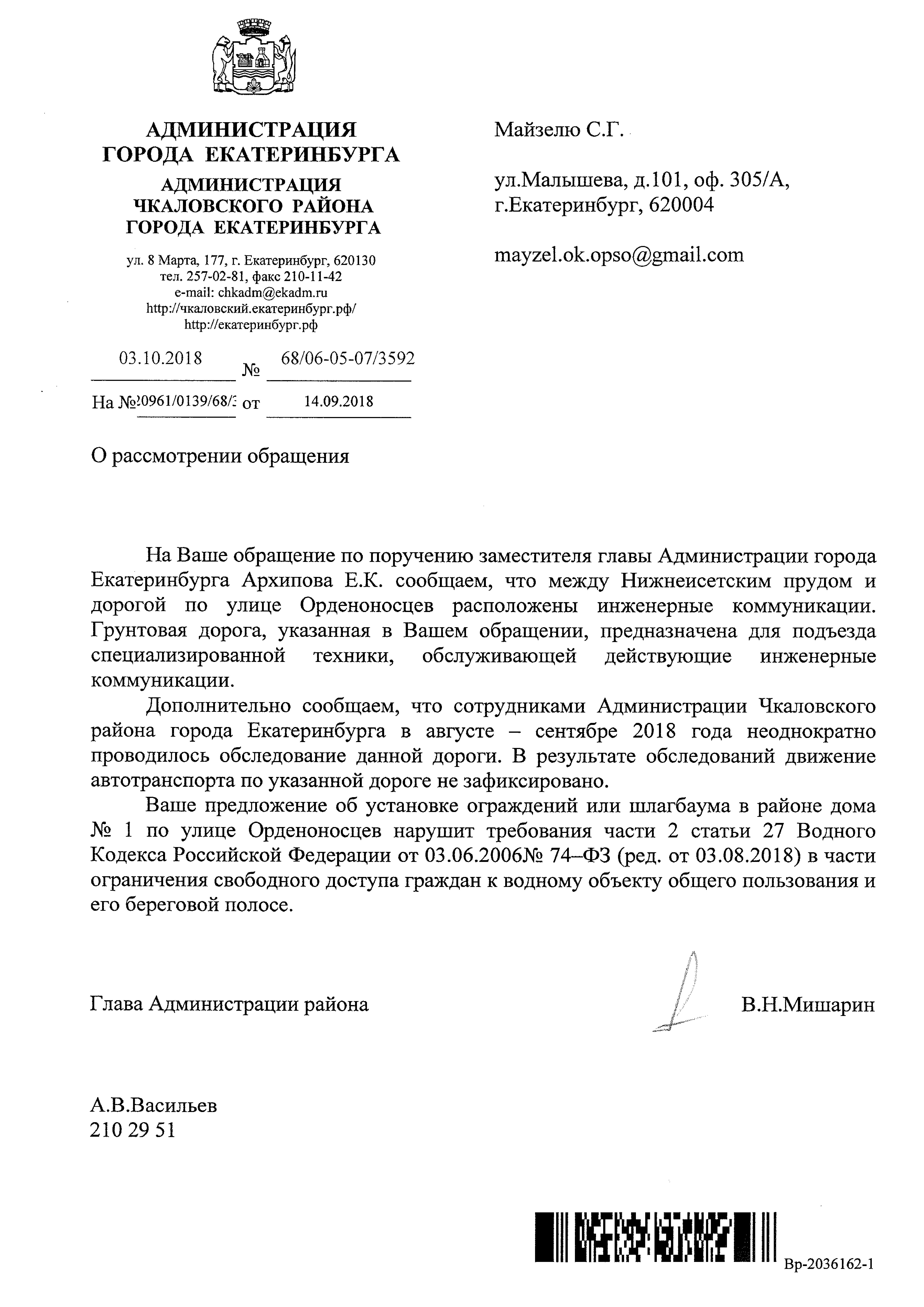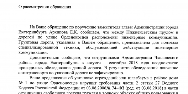 Номер жалобы:41469 Тип жалобы:Прочее Название объекта:Мэрия Регион:Свердловская область Город:Екатеринбург Адрес:улица Орденоносцев, 4, 6 Описание жалобы:В нарушение ст. 65 Водного кодекса РФ в водоохранной зоне Нижнеисетского пруда осуществляется движение автотранспорта вне автомобильных дорог. В ответе Администрации Екатеринбурга на жалобу 39851 сообщается, что данная грунтовая дорога предназначена для подъезда спецтехники, обслуживающей инженерные коммуникации. На данную дорогу не ограничен доступ личного автотранспорта. Заезд в водоохранную зону осуществляется в районе дома 1 по улице Орденоносцев. С целью предотвращения нарушения законодательства необходимо установить ограждения, либо шлагбаум в районе дома 1 по улице Орденоносцев, где дорога входит в водоохранную зону. Статус: