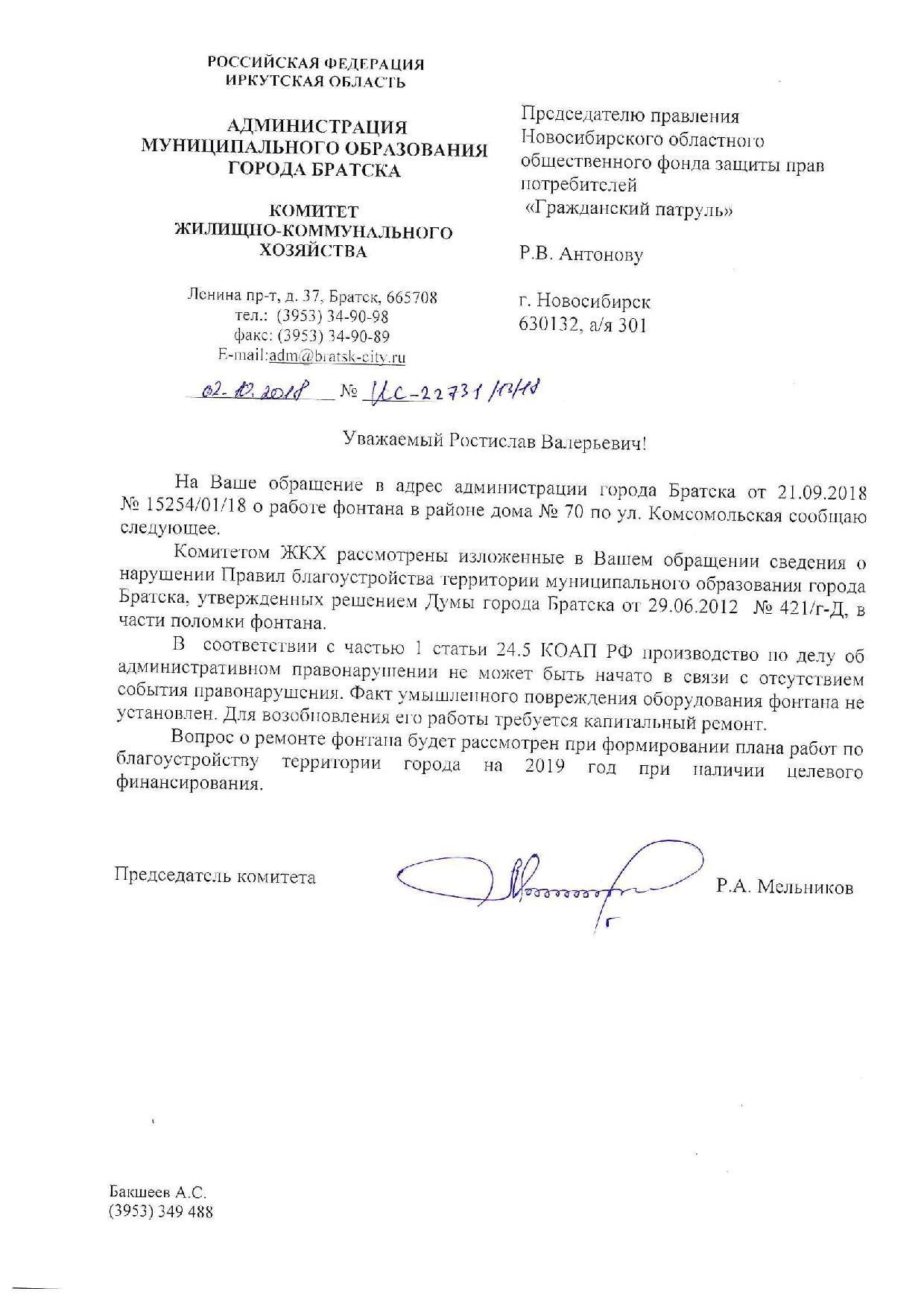 Номер жалобы:41490 Тип жалобы:Прочее Название объекта:Администрация Регион:Иркутская область Город:Братск Адрес:Комсомольская ул., 91а Описание жалобы:Сломан фонтан. Не работает всё лето Статус: