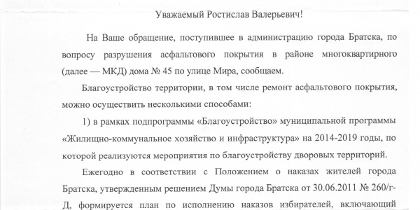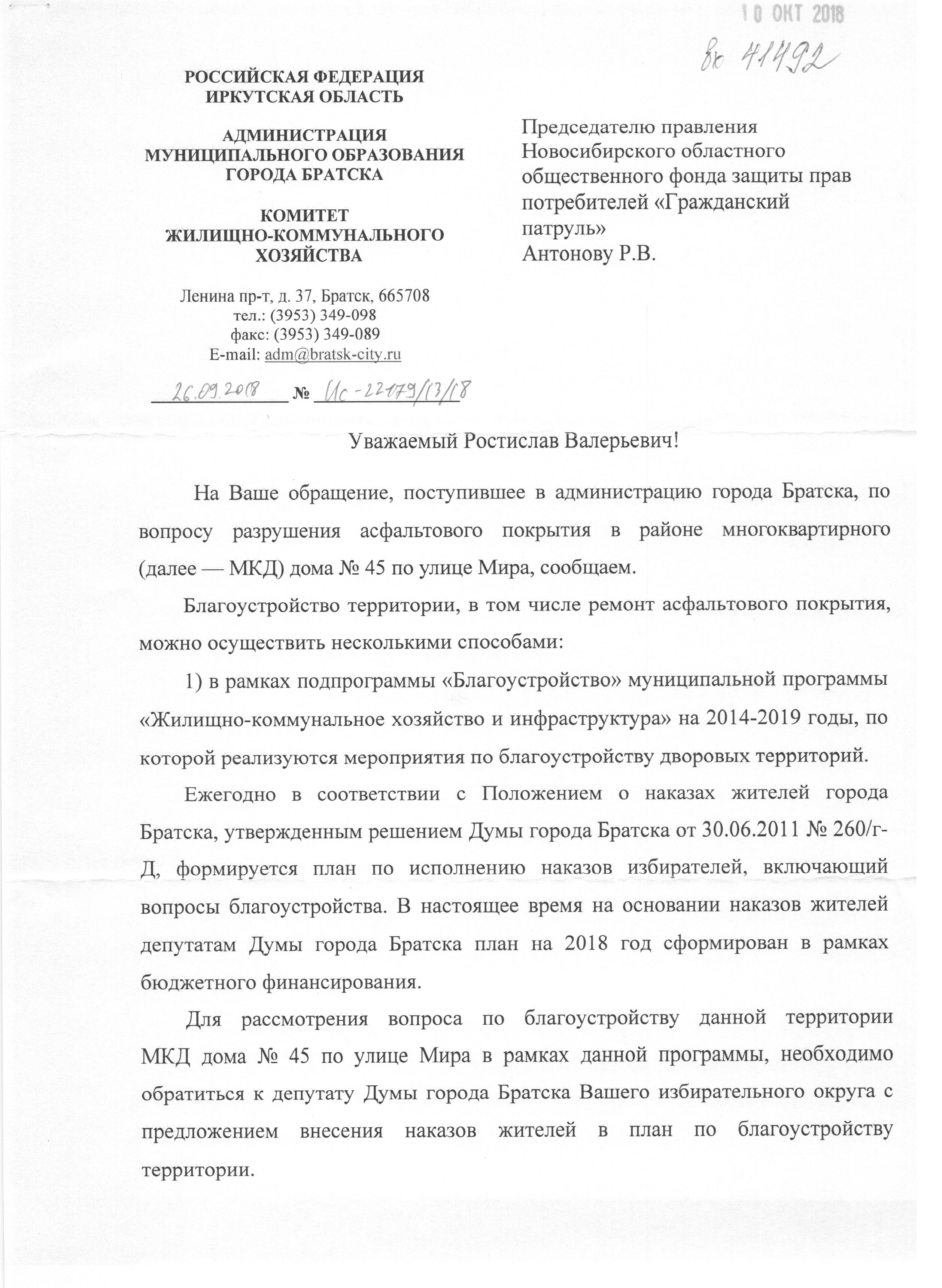 Номер жалобы:41492 Тип жалобы:Прочее Название объекта:Администрация Регион:Иркутская область Город:Братск Адрес:ул. Мира, 45 Описание жалобы:Разрушено и не восстановлено благоустройство Статус: