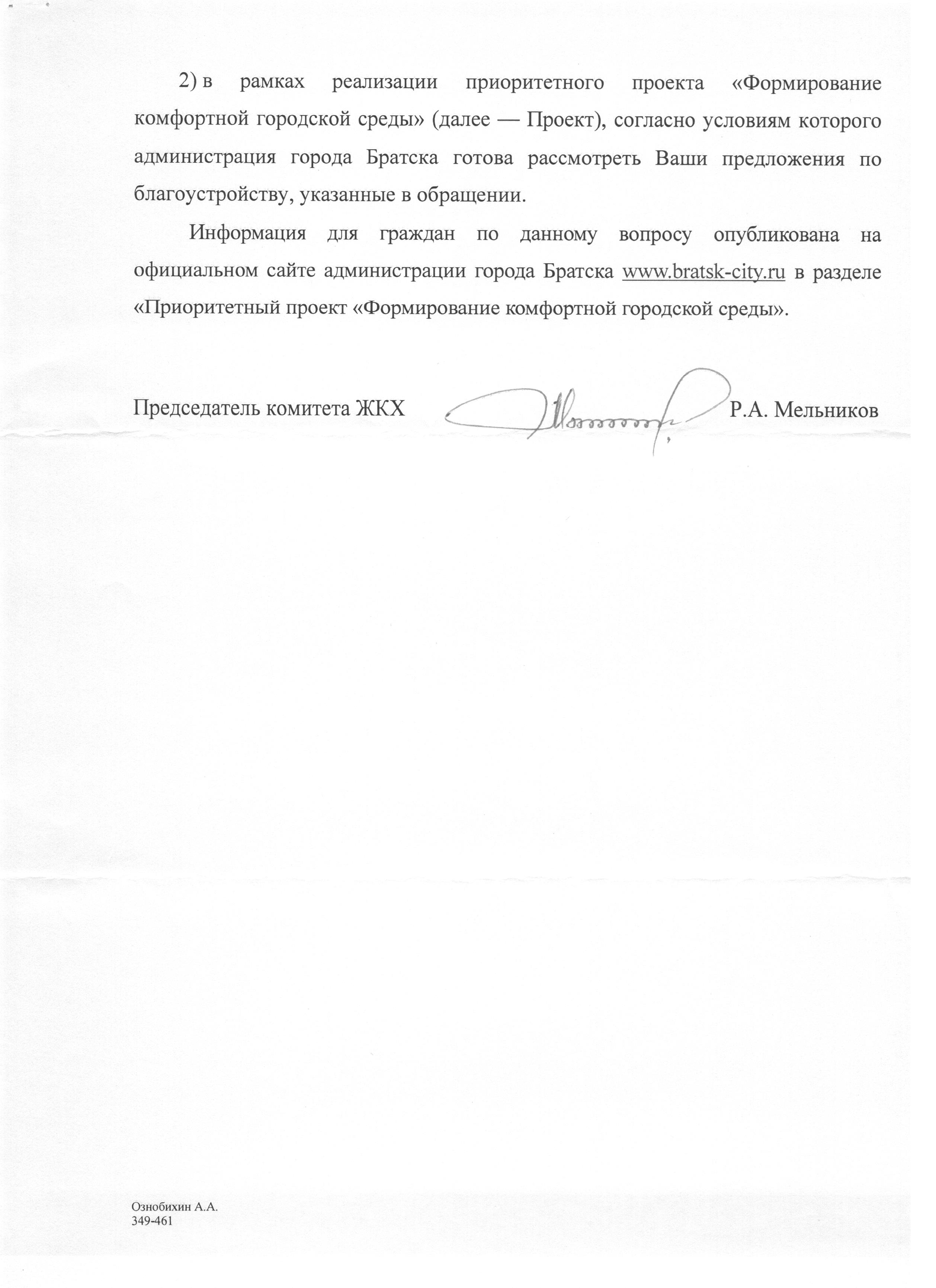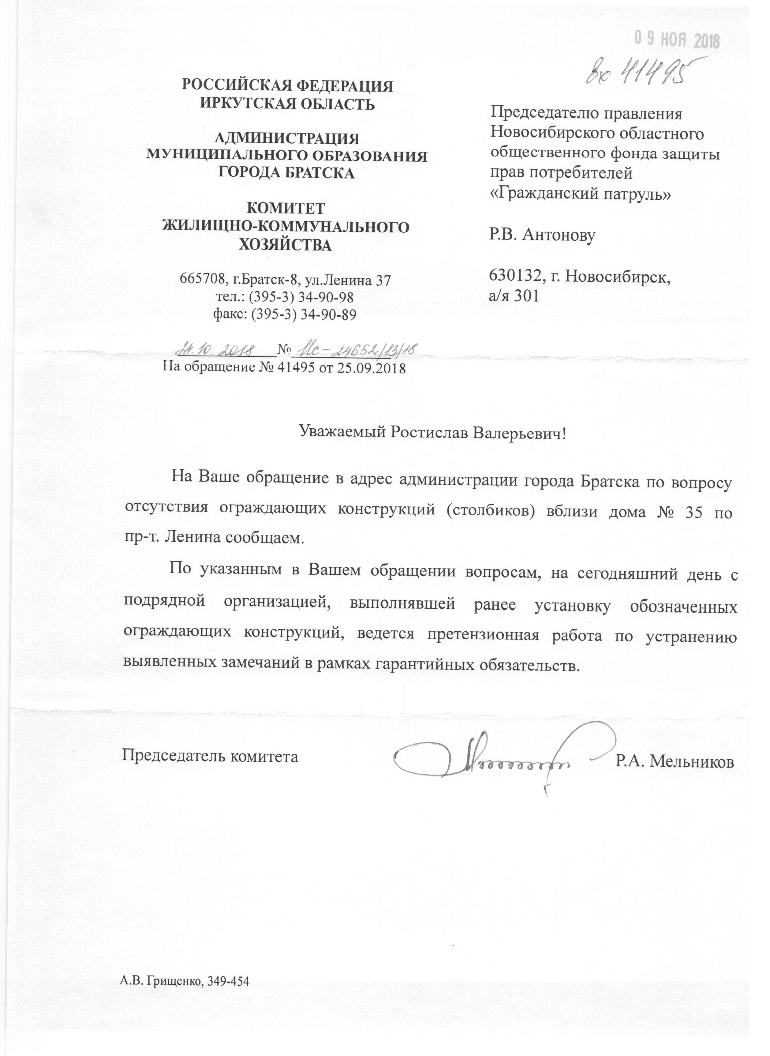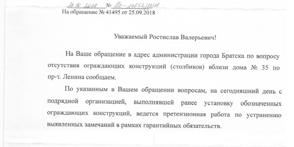 Номер жалобы:41495 Тип жалобы:Прочее Название объекта:Администрация Регион:Иркутская область Город:Братск Адрес:пр. Ленина, 37 Описание жалобы:Не восстановлено ограждение у въезда на тротуар, не смотря на ранее предоставленный ответ с гарантией сделать это в течении лета Статус:
