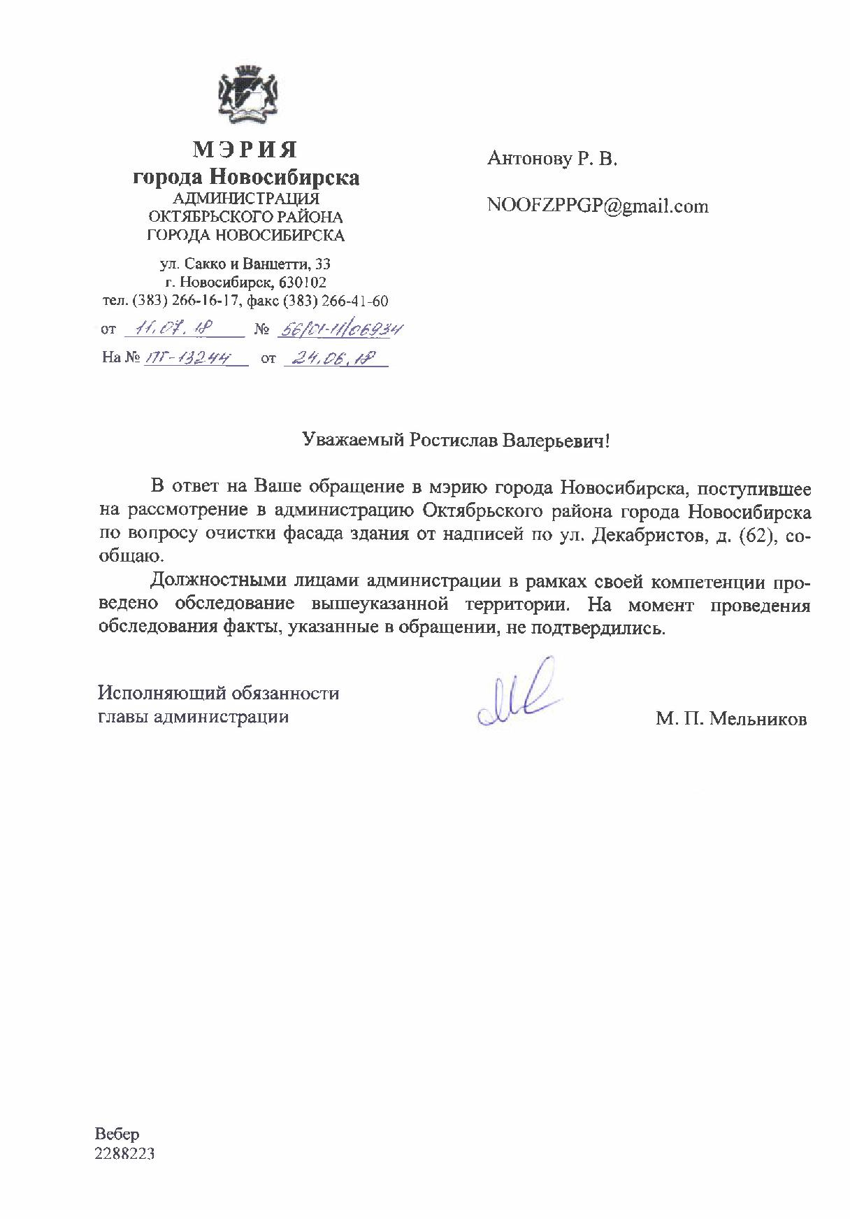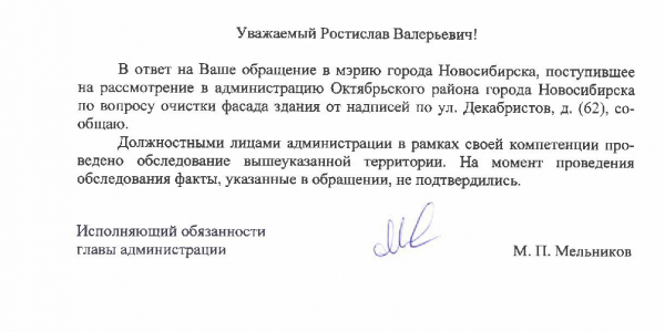 Номер жалобы:37302 Тип жалобы:Иные проблемы ЖКХ Название объекта:Управляющая Компания Регион:Новосибирская область Город:Новосибирск Адрес:ул. Добролюбова, 14 Описание жалобы:Надписи на фасаде дома Статус: