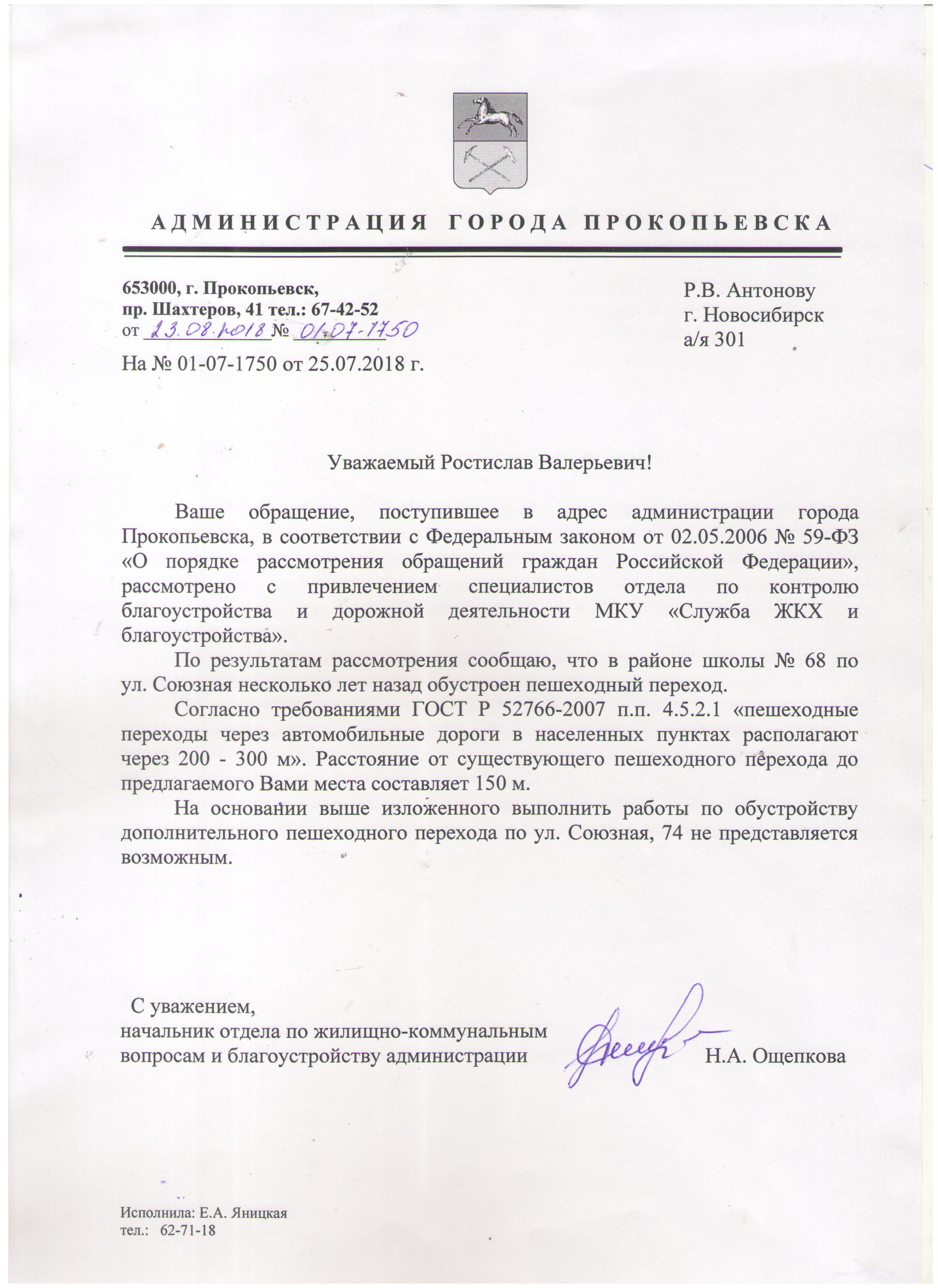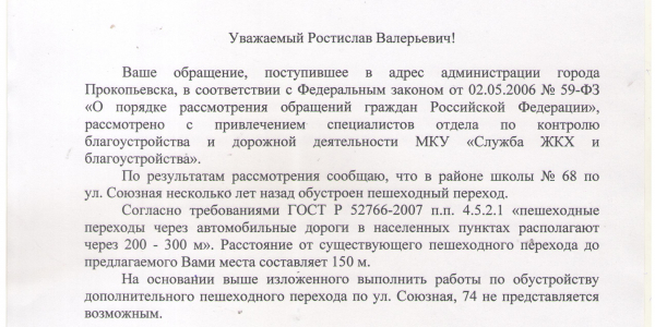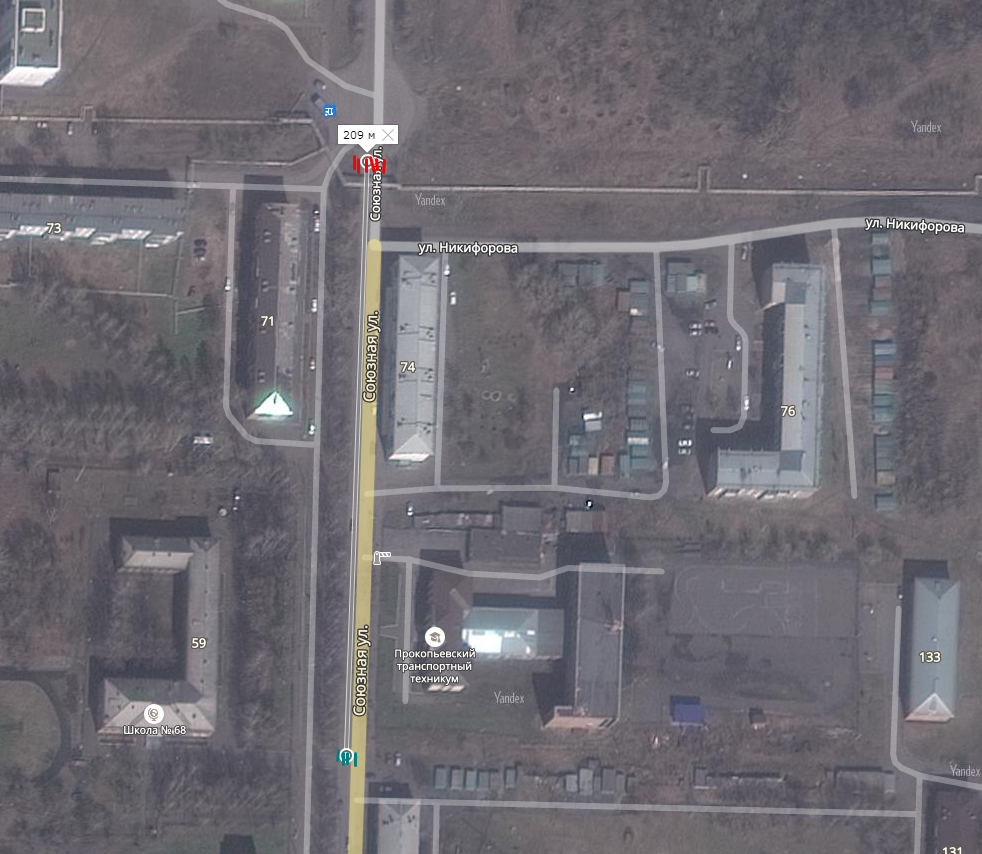 Номер жалобы:41404 Тип жалобы:Прочее Название объекта:9 Регион:Кемеровская область Город:Прокопьевск Адрес:Союзная улица Описание жалобы:Повтор 39037 Там в соответствии с ГОСТом не выходит 200 метров. Но если разместить на 15 метров севернее то будет 210 метров что попадает под стандарты ГОСТа. Нижняя отметра это ближайший переход, верхняя это куда необходимо разместить дополнительный. Там идет большой человеко-поток изза магазина и автобусной остановки Статус: