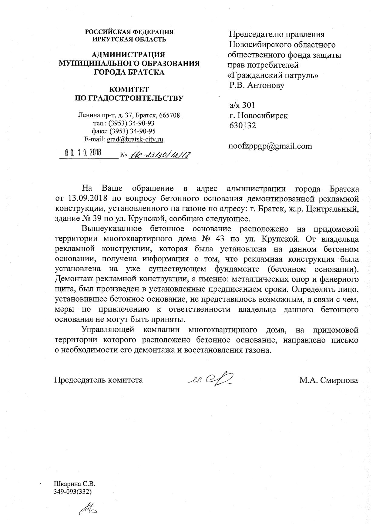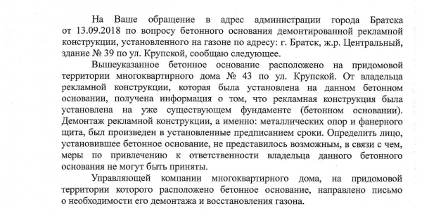 Номер жалобы:41380 Тип жалобы:Прочее Название объекта:Администрация Регион:Иркутская область Город:Братск Адрес:ул. Крупской, 39 Описание жалобы:После демонтажа незаконно установленного рекламного щита оставлено бетонное основание на территории газона, что нарушает благоустройство Статус: