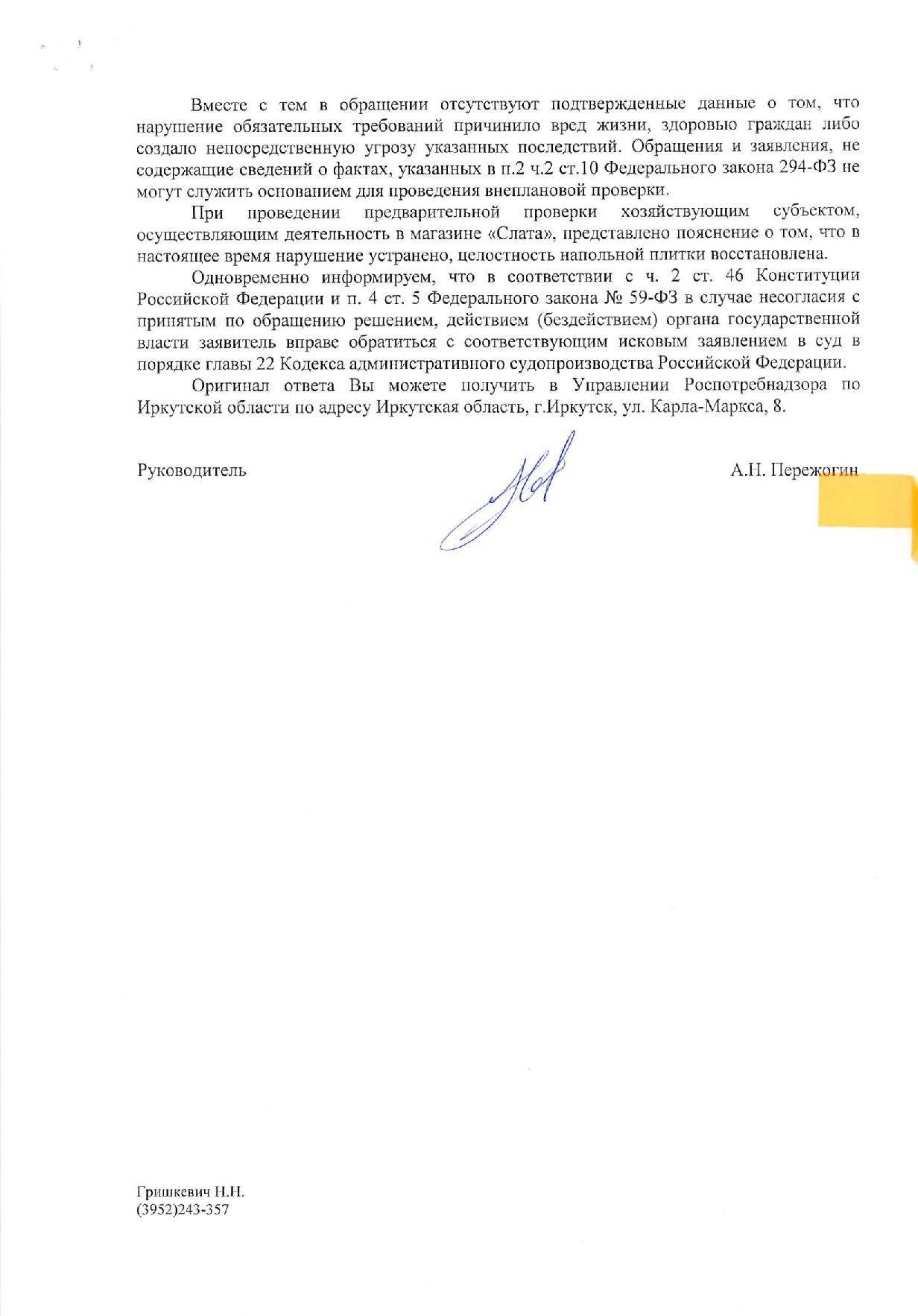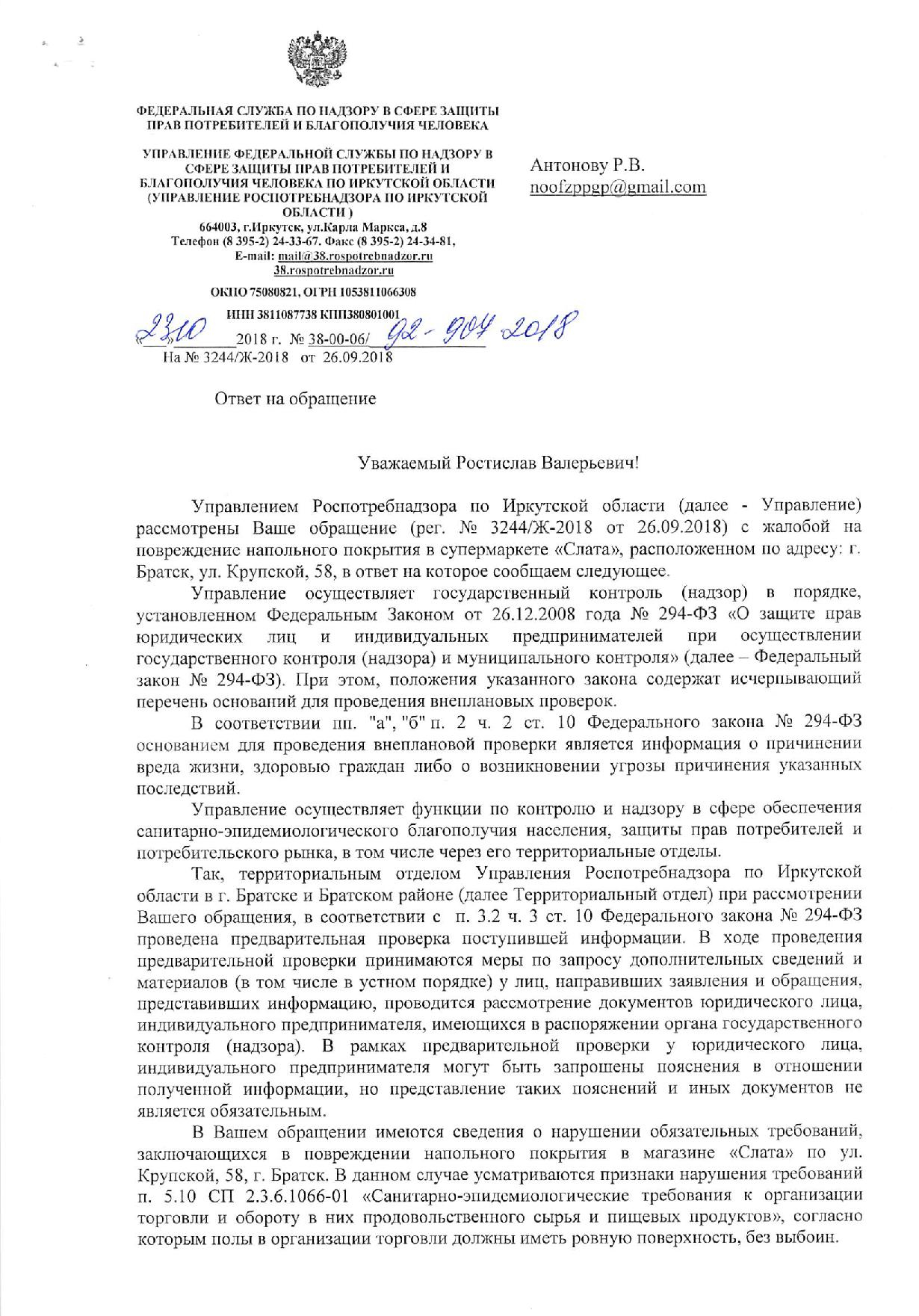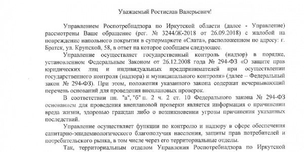 Номер жалобы:41427 Тип жалобы:Прочее Название объекта:《СЛАТА》 Регион:Иркутская область Город:Братск Адрес:ул. Крупской, 58 Описание жалобы:По адресу: Иркутская область, г.Братск, ул. Купской, 58 в супермаркете 《СЛАТА》 образовалась дырка в половом покрытии. Прошу устранить данную ситуацию. Статус:
