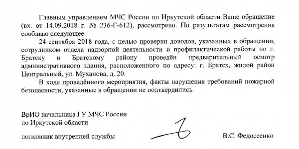 Номер жалобы:41429 Тип жалобы:Прочее Название объекта:Администрация Регион:Иркутская область Город:Братск Адрес:ул. Муханова, 20 Описание жалобы:Нет лампы над аварийным выходом из здания роспотребнадзорв. Вероятно, на двери нет ручки для открывания без ключа в случае пожара Статус: