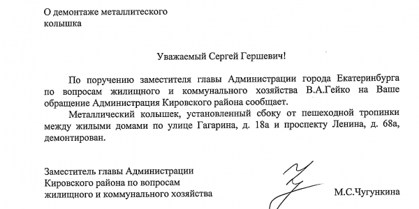 Номер жалобы:41437 Тип жалобы:Прочее Название объекта:ООО «Фонд Радомир» Регион:Свердловская область Город:Екатеринбург Адрес:улица Гагарина, 18А Описание жалобы:При установке забора вокруг придомовой территории дома 18а по улице Гагарина между домами 18а по улице Гагарина и 68а по проспекту Ленина сбоку от пешеходной дорожки, проходящей между этими домами, был установлен вспомогательный металлический колышек. После установки забора данный колышек демонтирован не был. Статус: