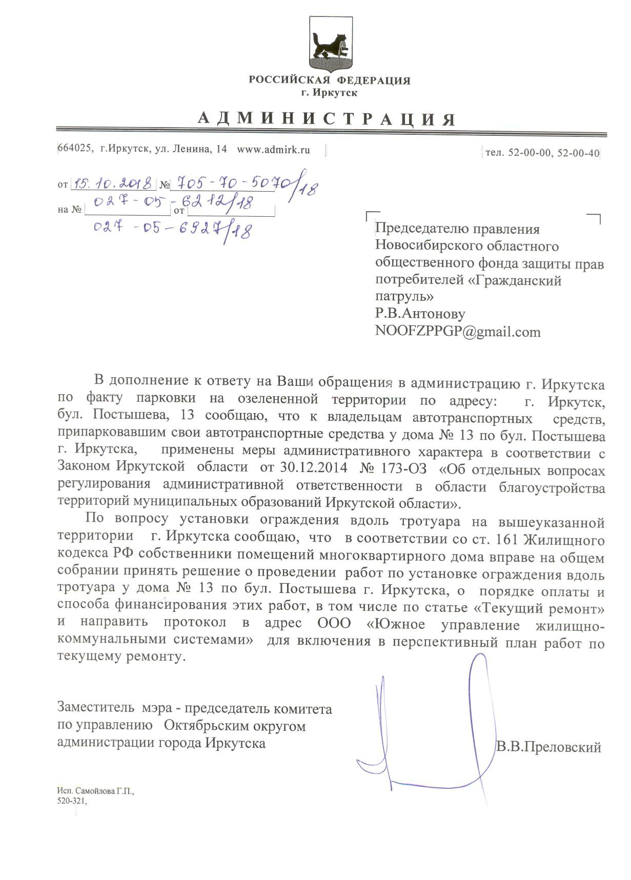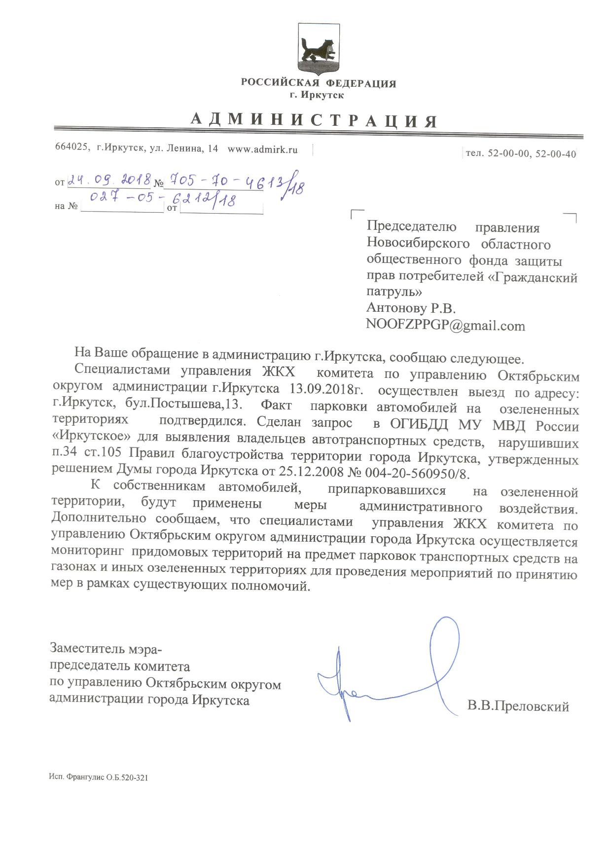 Номер жалобы:41060 Тип жалобы:Прочее Название объекта:ГИБДД Регион:Иркутская область Город:Иркутск Адрес:б-р Постышева, 13 Описание жалобы:Парковка на газоне с проездом по тротуару Статус: