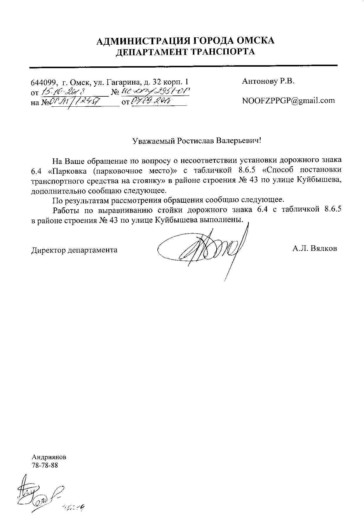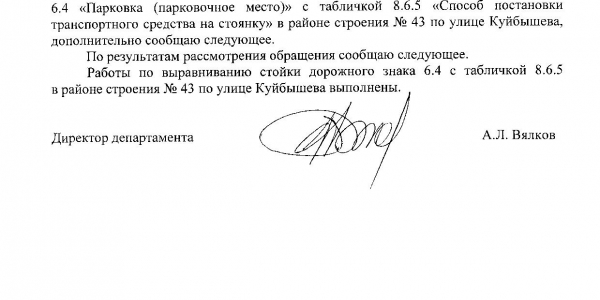 Номер жалобы:41068 Тип жалобы:Прочее Название объекта:? Регион:Омская область Город:Омск Адрес:ул. Куйбышева, 43 Описание жалобы:Этот знак парковки наклонился над тротуаром. Кого нибудь из прохожих точно припаркует Статус: