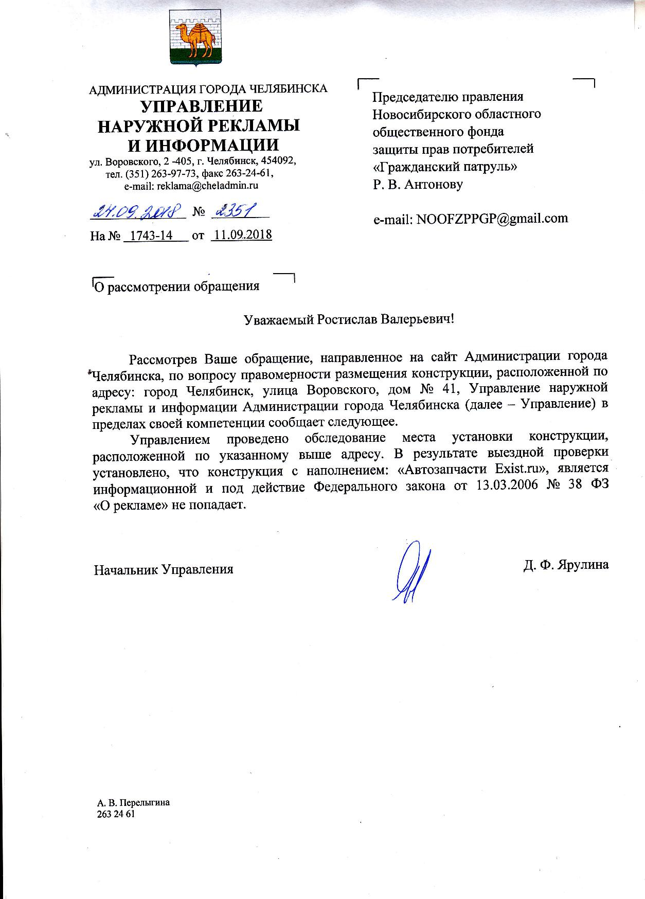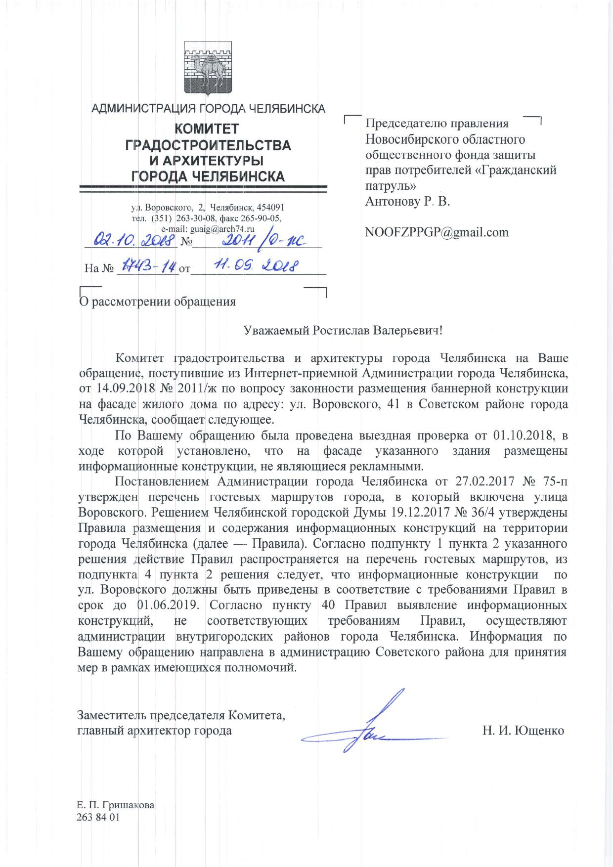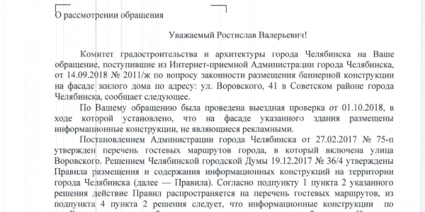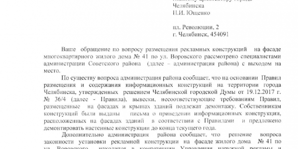 Номер жалобы:41096 Тип жалобы:Прочее Название объекта:Администрация Регион:Челябинская область Город:Челябинск Адрес:Е30, 41 Описание жалобы:Вывески на фасаде здания закрывают окна, реклама. Воровского,41 Статус: