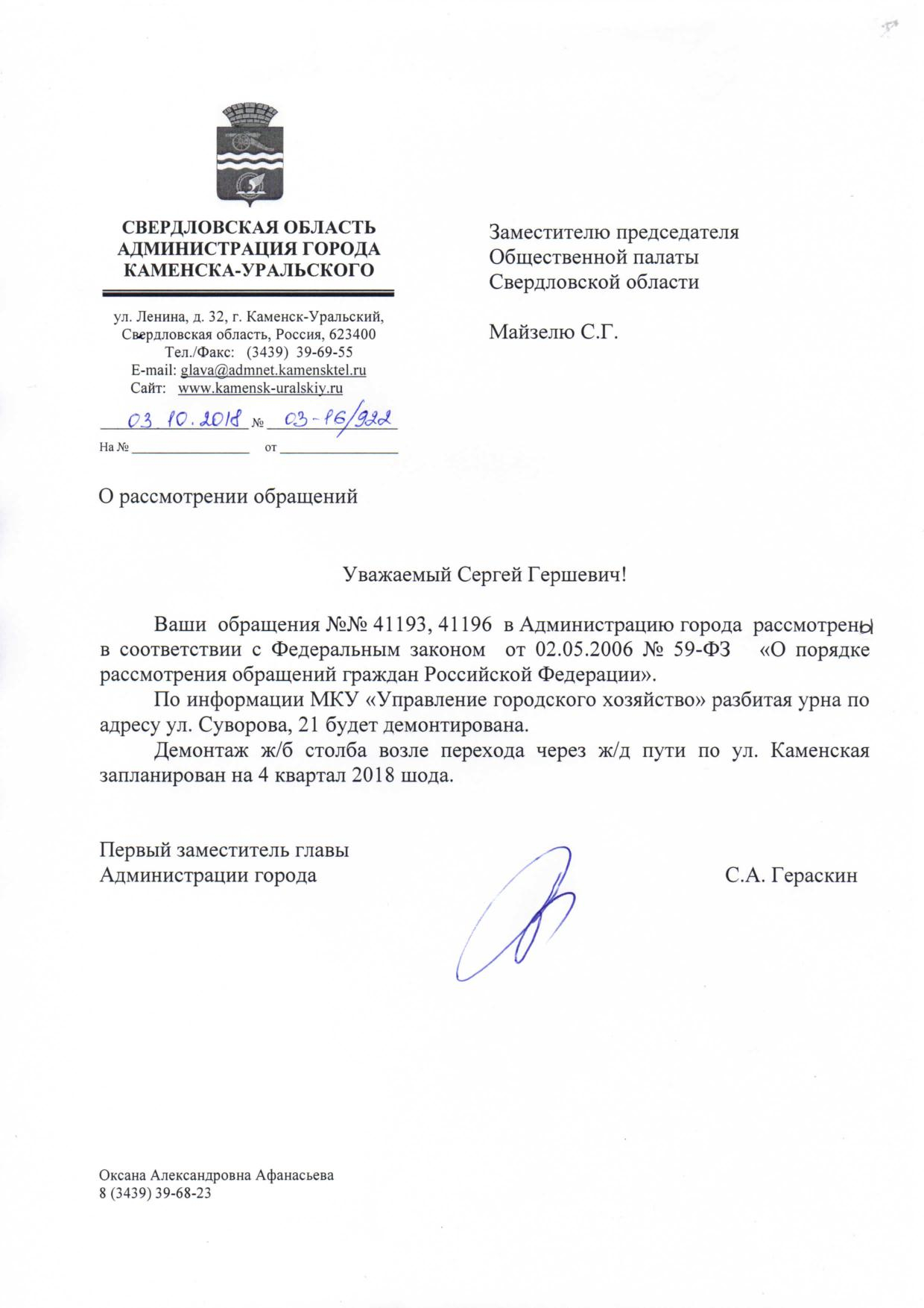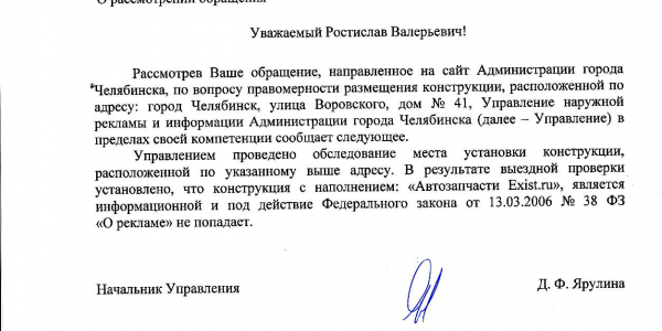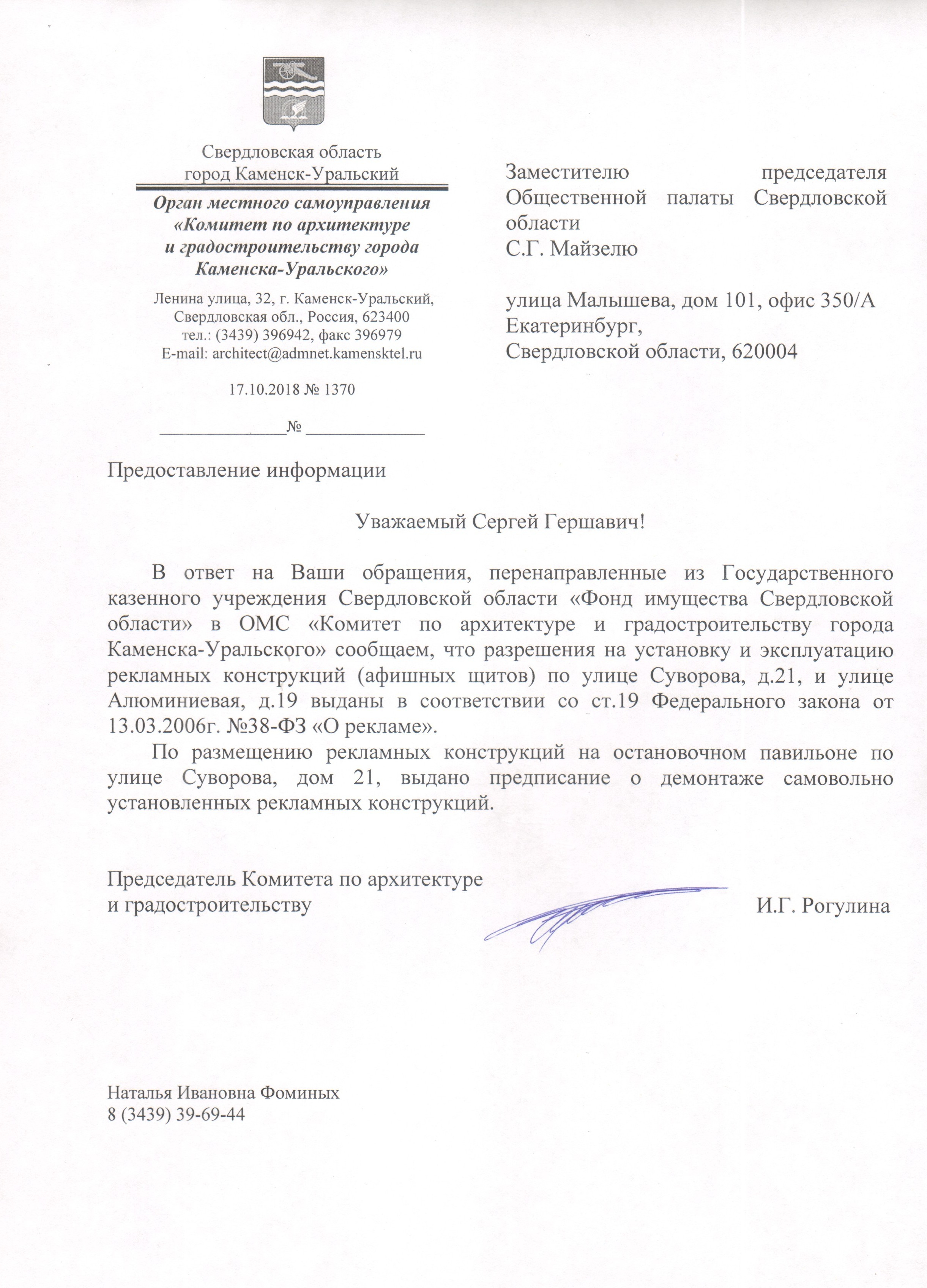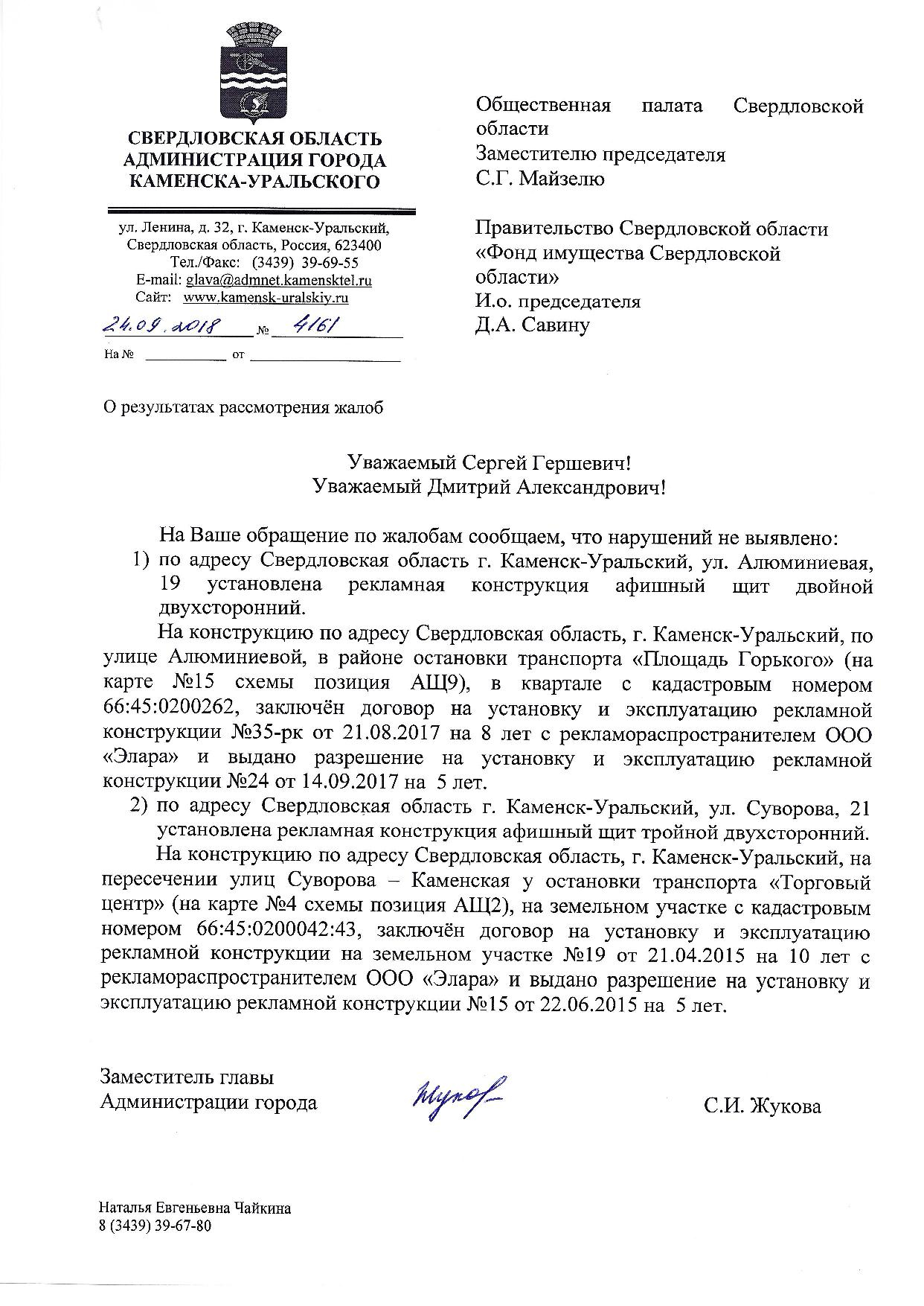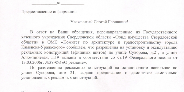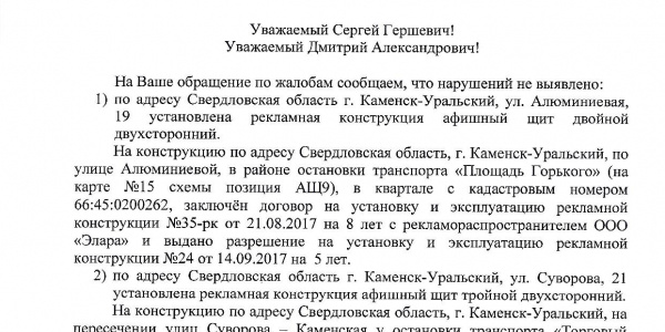 Номер жалобы:41176 Тип жалобы:Прочее Название объекта:Администрация Города Каменск-уральский Регион:Свердловская область Город:Каменск-Уральский Адрес:Алюминиевая ул., 19 Описание жалобы:Проверить законность рекламных конструкций Статус: