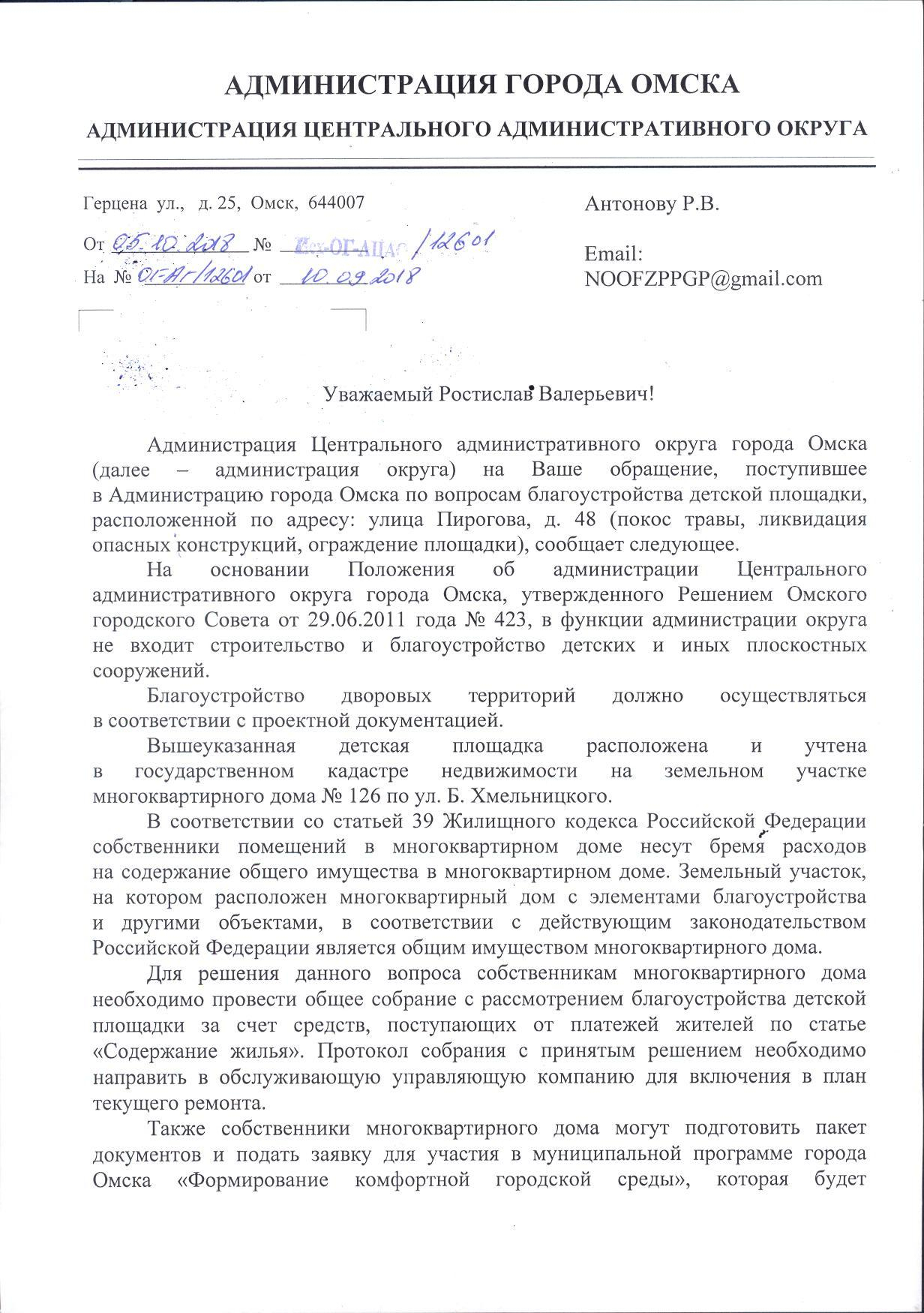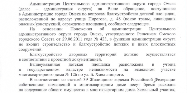 Номер жалобы:41178 Тип жалобы:Прочее Название объекта:? Регион:Омская область Город:Омск Адрес:ул. Пирогова, 48 Описание жалобы:Детская площадка во дворе дома в запущенном состоянии. Вокруг трава, кустарники, непонятные конструкции, нет ограждения от машин со стороны дома 126 по Богдана Хмельницкого. Автомобильные покрышки в траве, очень мало сооружений для детей, песочница не огорожена, деревья нуждаются в обрезке нижних ветвей Статус: