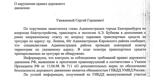 Номер жалобы:41090 Тип жалобы:Прочее Название объекта:Мэрия Регион:Свердловская область Город:Екатеринбург Адрес:Ленина, 68г Описание жалобы:Стоянка на тротуаре, проходящем вдоль проезда к ДЮСШ «Виктория», на участке между домами 68в и 68г по проспекту Ленина. Статус: