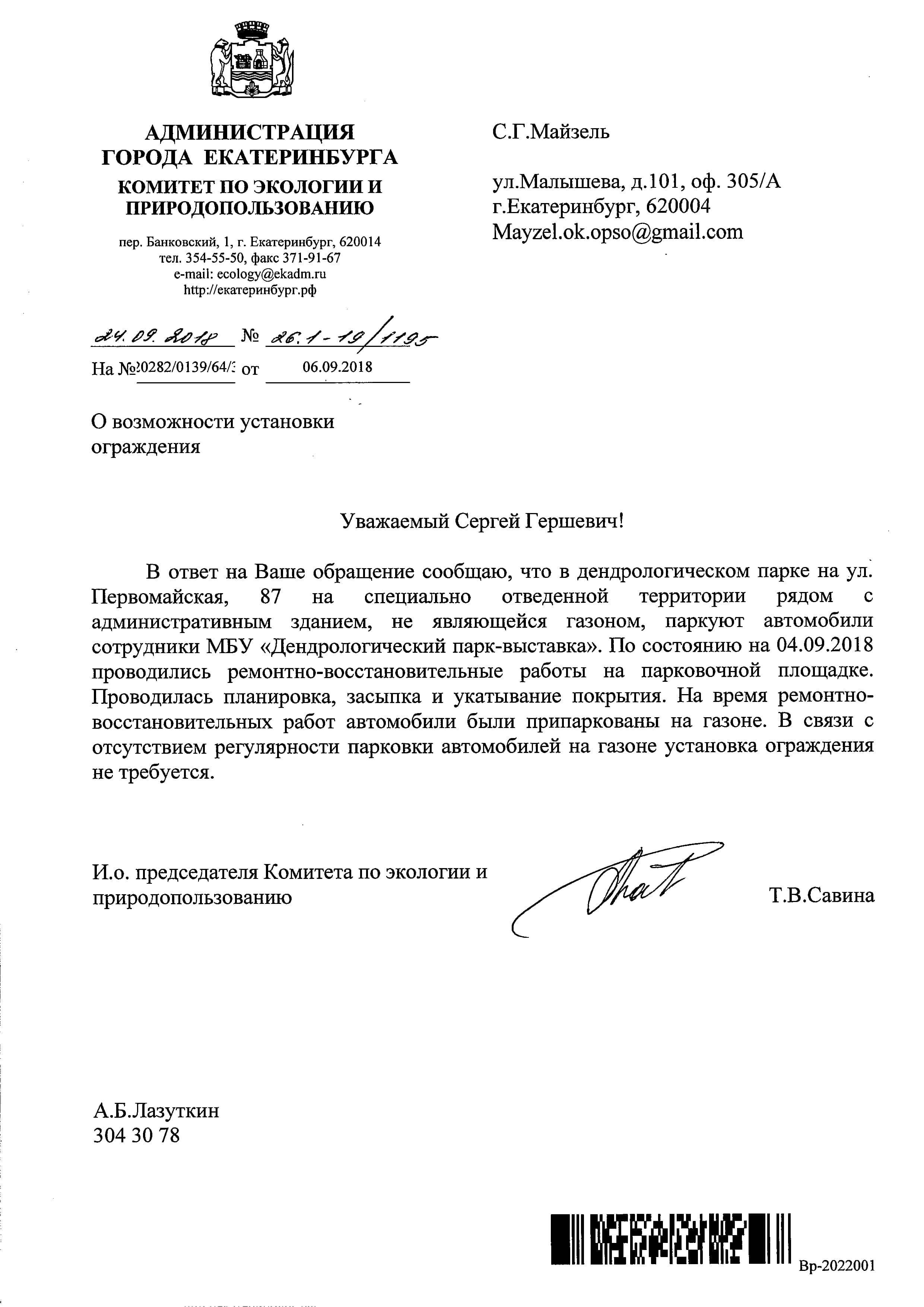 Номер жалобы:41012 Тип жалобы:Прочее Название объекта:Мэрия Регион:Свердловская область Город:Екатеринбург Адрес:Первомайская улица, 87 Описание жалобы:Руководством дендрологического парка, расположенного на улице Первомайской, для работников парка организована стоянка машин на его территории возле здания администрации. Подъезд к стоянке возможен только по пешеходным дорожкам парка. Статус: