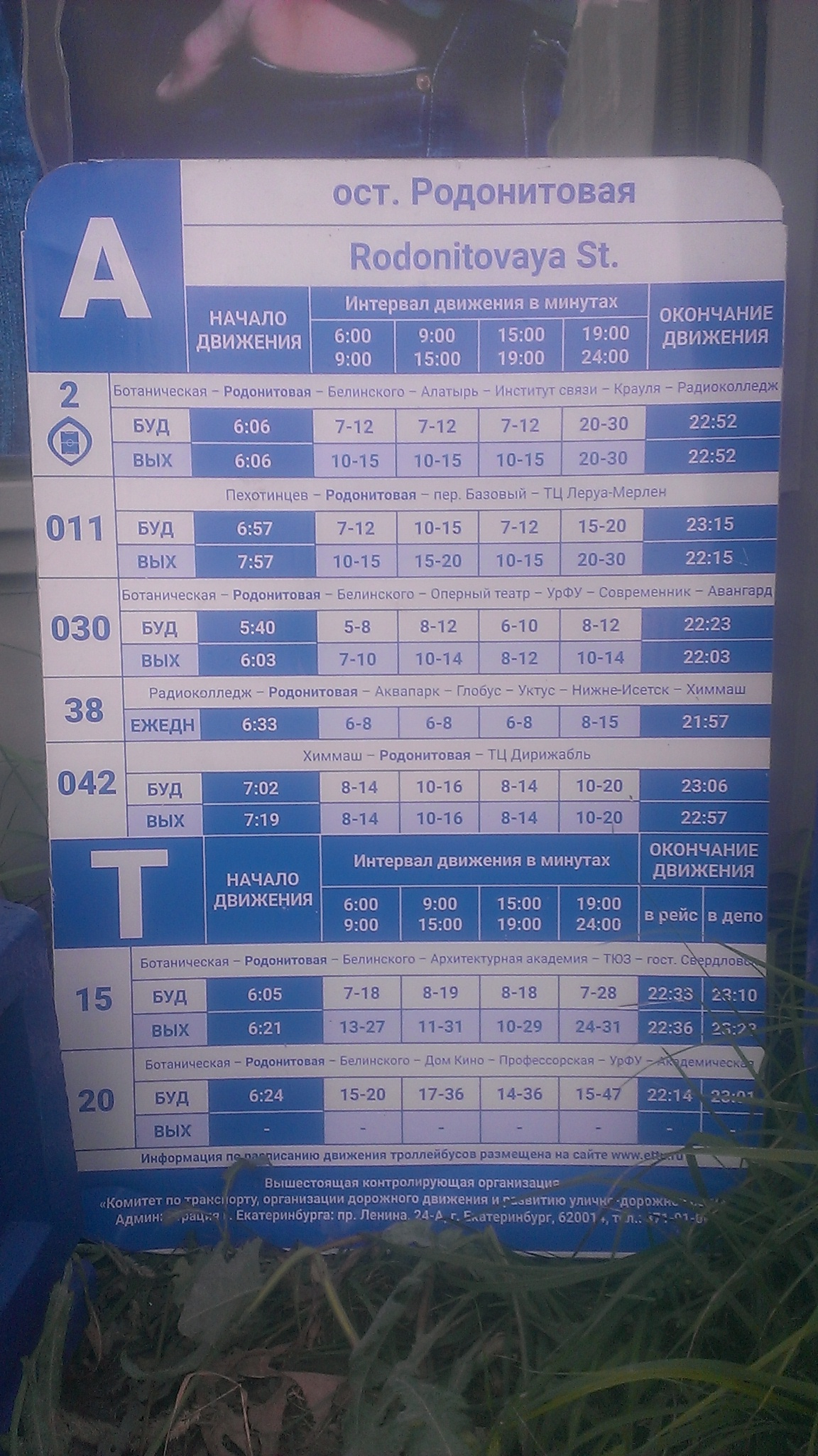 Номер жалобы:41030 Тип жалобы:Прочее Название объекта:Мэрия Регион:Свердловская область Город:Екатеринбург Адрес:Родонитовая улица, 13 Описание жалобы:На остановке «Родонитовая» в сторону улицы Белинского расписание движения транспорта стоит на земле. Статус: