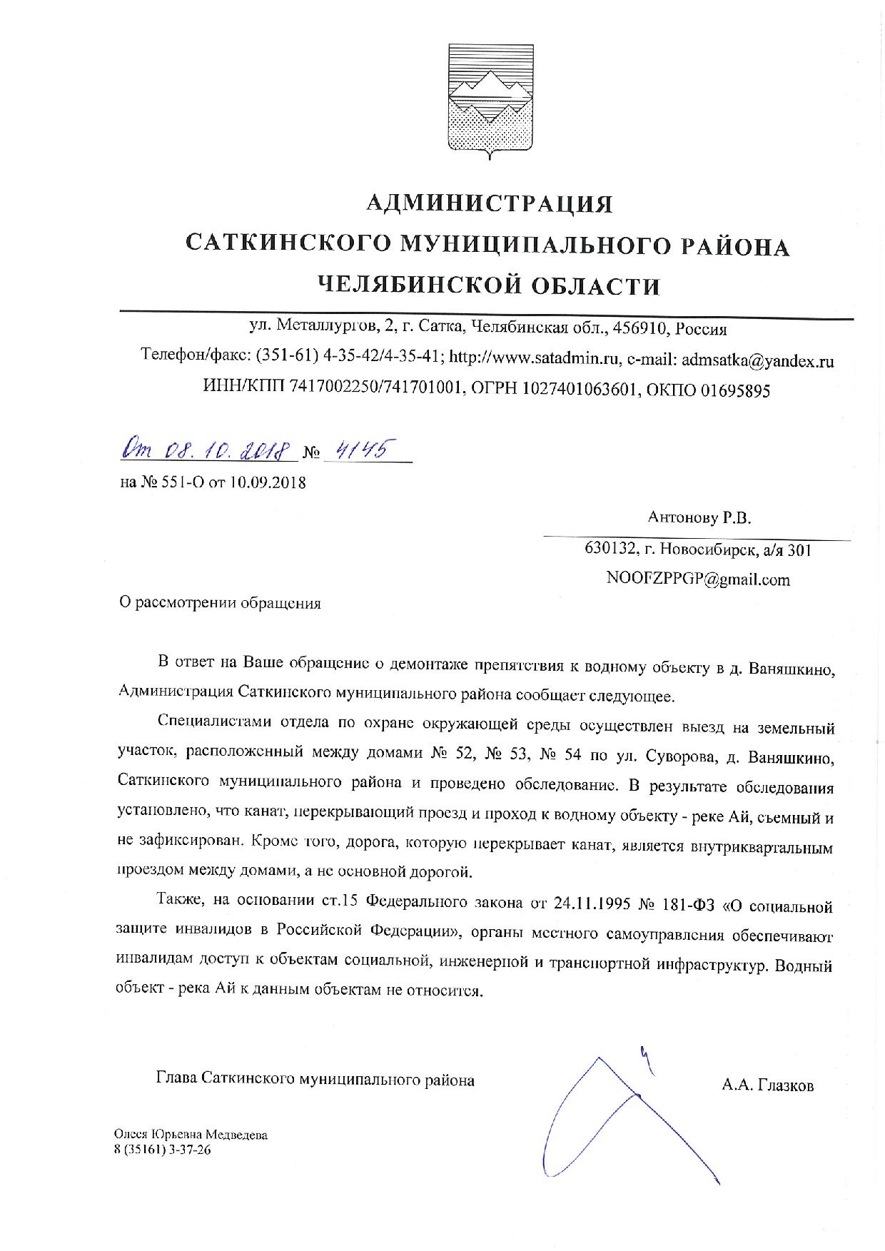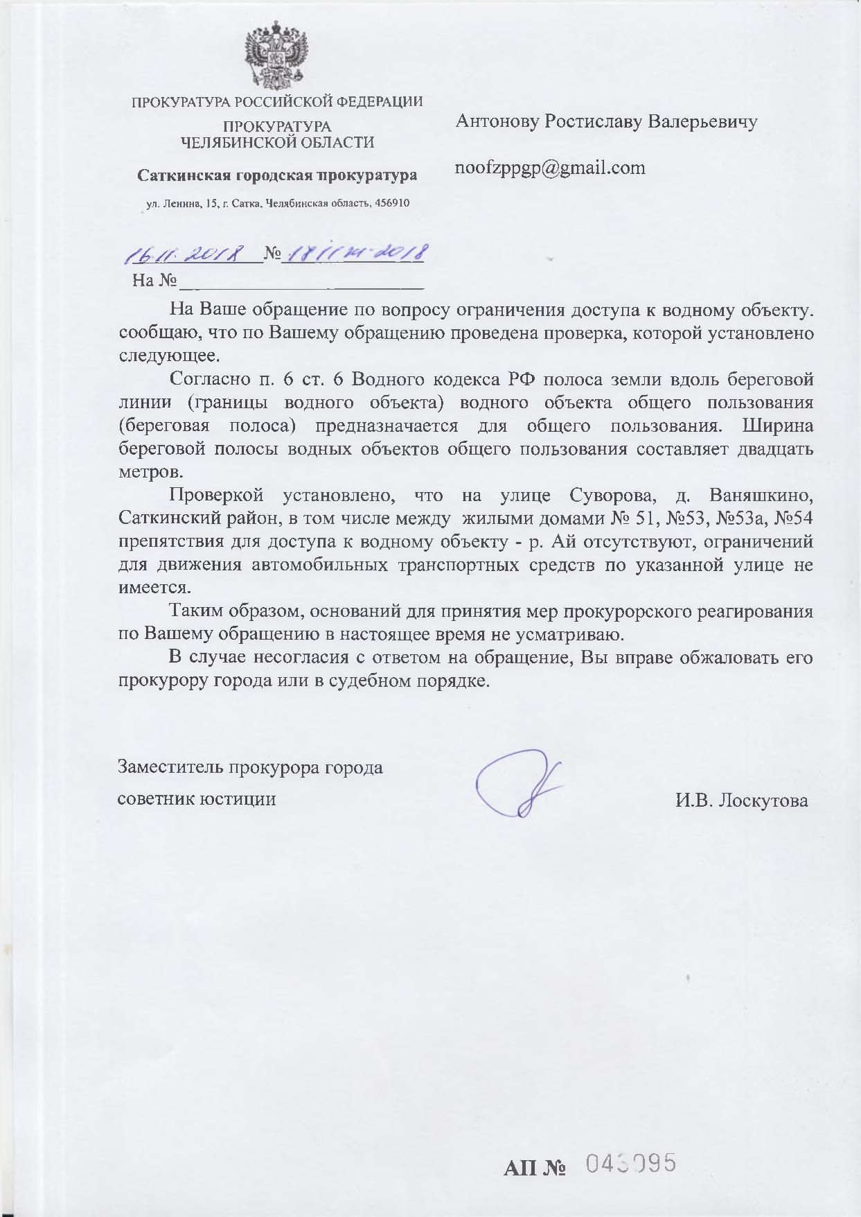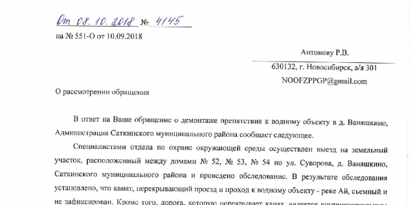Номер жалобы:41039 Тип жалобы:Прочее Название объекта:Администрация Межевого городского поселения Челябинской области Регион:Красноярский край Город:деревня Ваняшкино Адрес:Суворова, 53 Описание жалобы:Проход по улице перекрыт канатом. По данной проблеме я обращался в жалобе 34924. В ответе Администрации Саткинского муниципального района Челябинской области сообщается, что канат установлен в границах водоохранной зоны, и его наличие не является нарушением, так как он перекрывает проезд и не препятствует передвижению граждан. Данная информация не соответствует действительности. Канат натянут на высоте 1 м на всю ширину улицы, закреплён за заборы по её краям и препятствует доступу в водоохранную зону граждан с ограниченными возможностями. Находящийся за канатом участок улицы Суворова является дорогой общего пользования. Ст. 65 Водного кодекса РФ, на которую ссылается Администрация, разрешает движение автотранспорта по дорогам, находящихся в водоохранных зонах. Таким образом, установленный канат ущемляет права неопределённого круга лиц на доступ в водоохранную зону. Необходимо демонтировать канат. Статус: