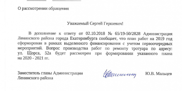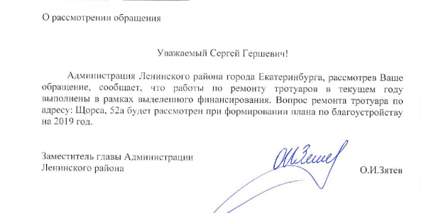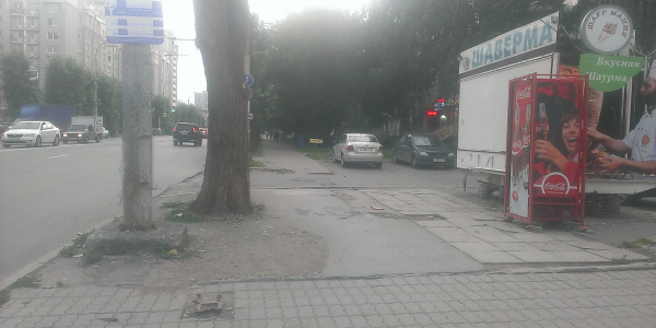 Номер жалобы:41037 Тип жалобы:Прочее Название объекта:Мэрия Регион:Свердловская область Город:Екатеринбург Адрес:улица Щорса, 52А Описание жалобы:Неровности на тротуаре вдоль чётной стороны улицы Щорса перед киоском «Шаверма», установленного на остановке «Щорса» в сторону южного автовокзала. Статус: