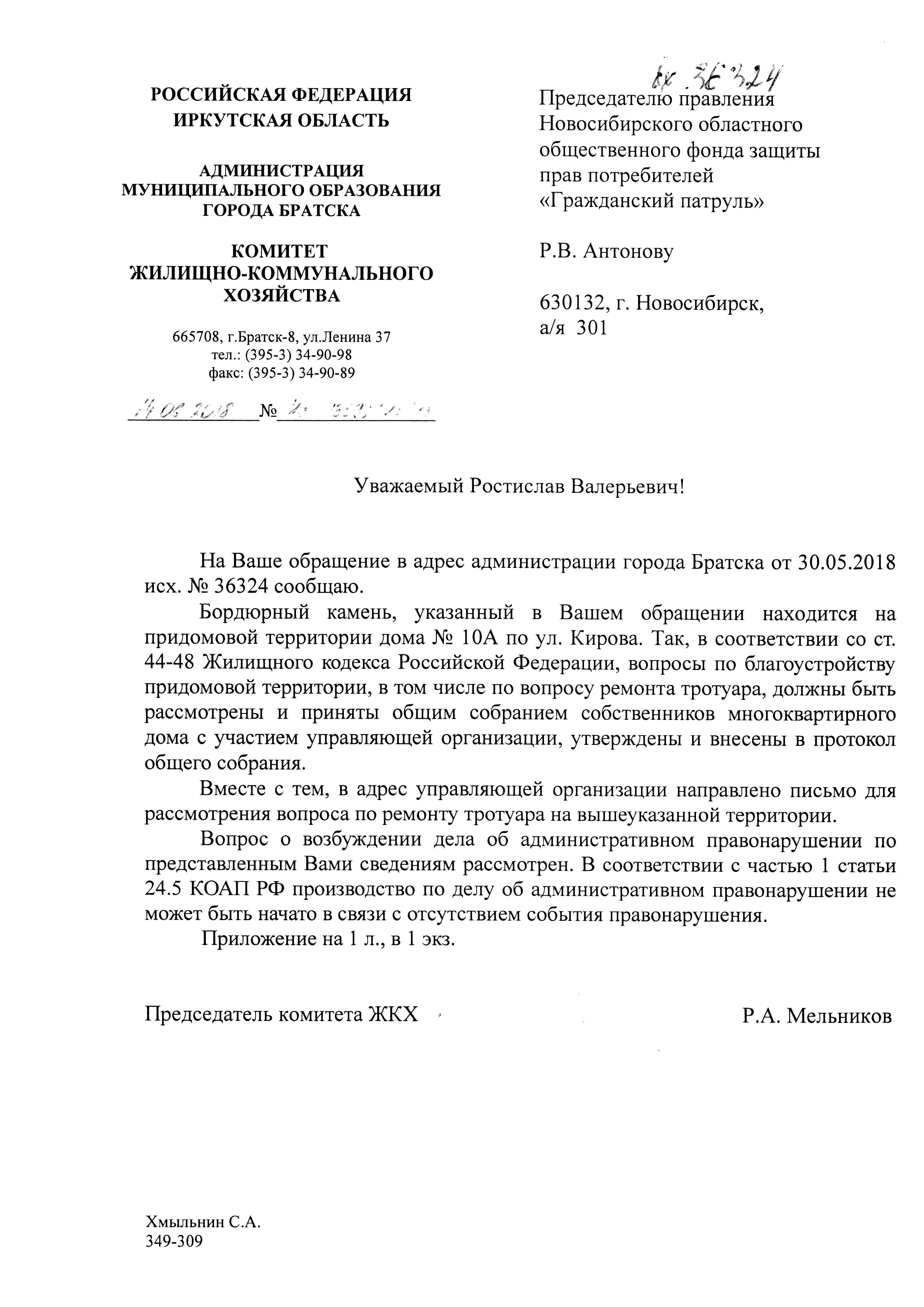Номер жалобы:36324 Тип жалобы:Иные проблемы ЖКХ Название объекта:ООО УК "Жилсервис" Регион:Иркутская область Город:Братск Адрес:ул. Кирова, 10а Описание жалобы:На углу дома 10а, в районе первого подъезда разломан бордюрный камень. Статус: