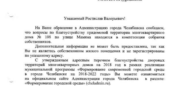 Номер жалобы:36393 Тип жалобы:Иные проблемы ЖКХ Название объекта:Нет Регион:Челябинская область Город:Челябинск Адрес:ул. Ржевская, 35 Описание жалобы:Ставят автомобили во дворе на газон! От газона почти уже ничего не осталось. Так же во дворе находится заброшенное строение в виде павильона. Вывеска продукты Статус: