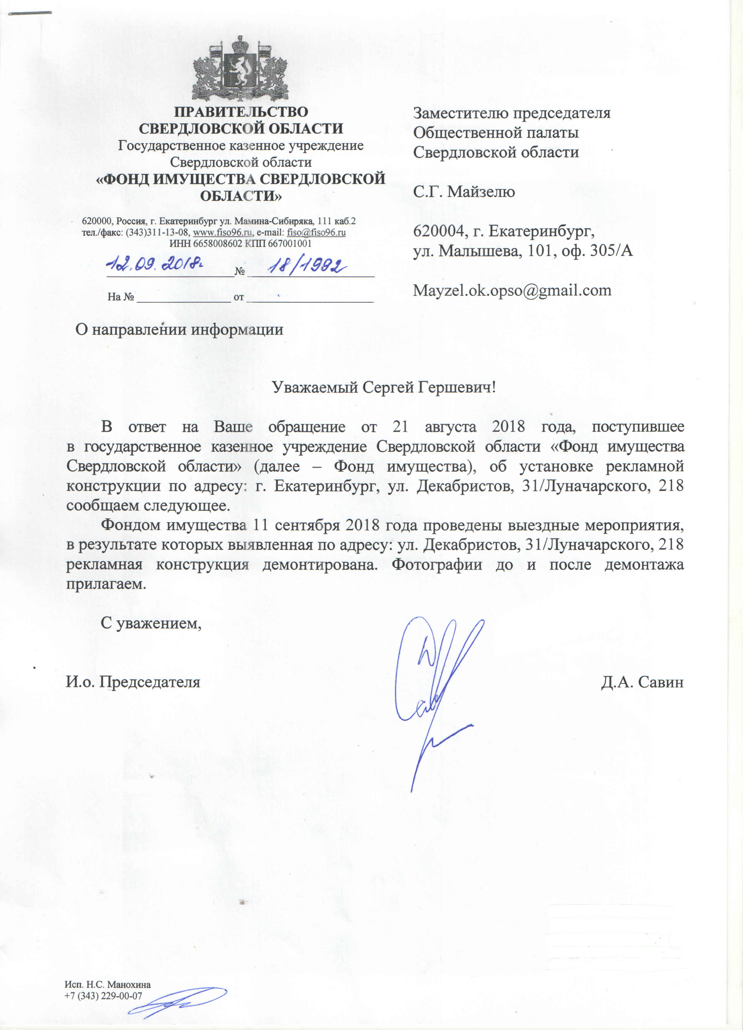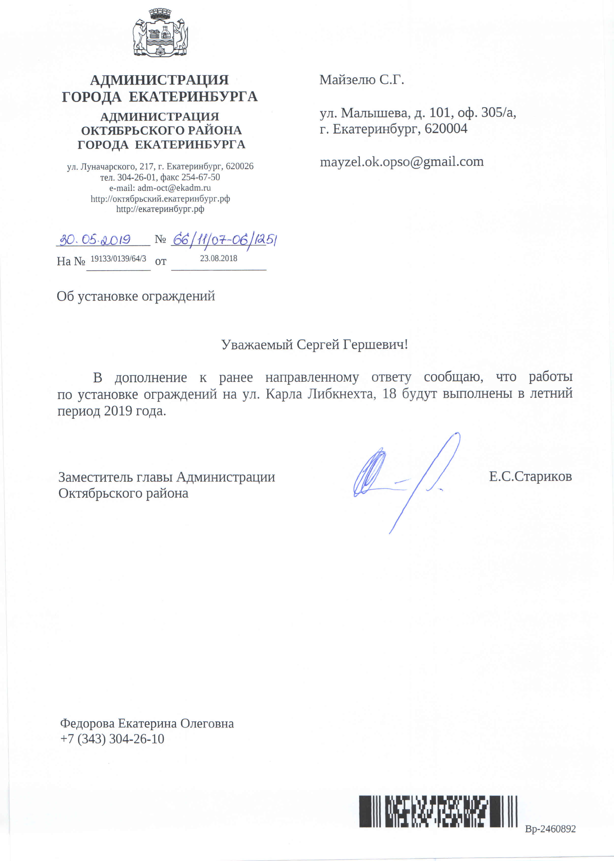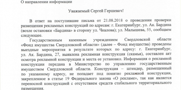 Номер жалобы:40242 Тип жалобы:Прочее Название объекта:Администрация Екатеринбурга Город:Екатеринбург Адрес:Екатеринбург, улица Малышева, 55 Описание жалобы:Прошу проверить законность размещения рекламных конструкций и обеспечить их ликвидацию в случае незаконного размещения. Конструкции расположены по ул. Малышева между ул. Мамина Сибиряка и ул. Красноармейская около строящегося жк “Opera Tower” Статус: