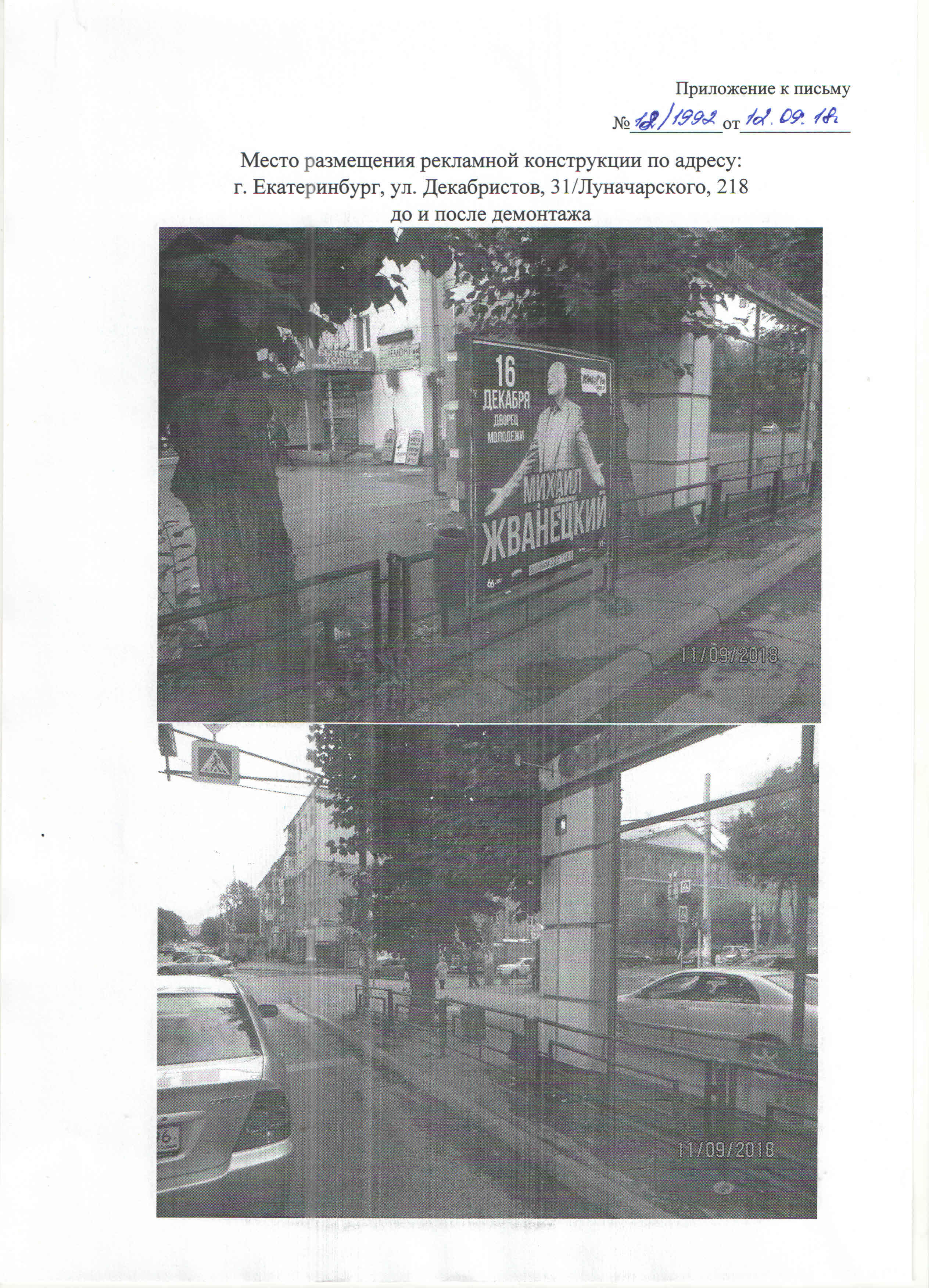 Номер жалобы:40252 Тип жалобы:Прочее Название объекта:? Регион:Свердловская область Город:Екатеринбург Адрес:ул. Декабристов, 31/218А Описание жалобы:Незаконный афишный стенд Статус: