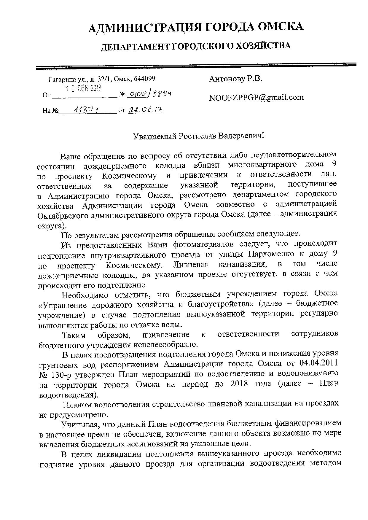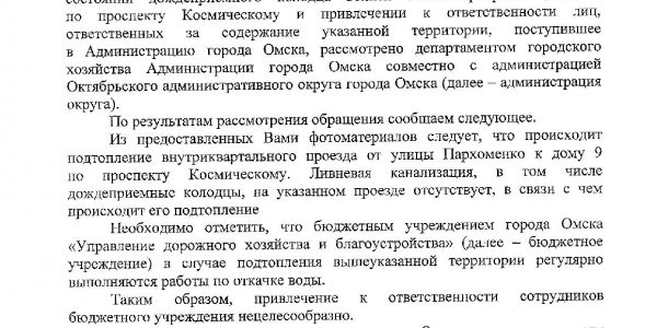 Номер жалобы:40265 Тип жалобы:Прочее Название объекта:Жкх Регион:Омская область Город:Омск Адрес:Космический пр., 9 Описание жалобы:Затоплена прилегающая дорога к дому, невозможно пройти Статус:
