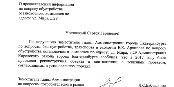Номер жалобы:40237 Тип жалобы:Прочее Название объекта:Администрация Екатеринбурга Регион:Свердловская область Город:Екатеринбург Адрес:улица Мира, 29 Описание жалобы:Согласно п. 151 Правил благоустройства Екатеринбурга, «Поверхности скамьи рекомендуется выполнять из дерева с различными видами водоустойчивой обработки». Однако сиденья скамьи под навесом на автобусной остановке «Мира», расположенной в районе дома 29 по улице Мира, выполнены из металла. Статус: