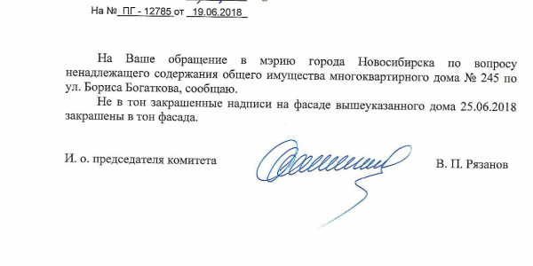 Номер жалобы:36058 Тип жалобы:Иные проблемы ЖКХ Название объекта:Управляющая Компания Регион:Новосибирская область Город:Новосибирск Адрес:ул. Бориса Богаткова, 245 Описание жалобы:Надписи закрашены не в тон Статус:
