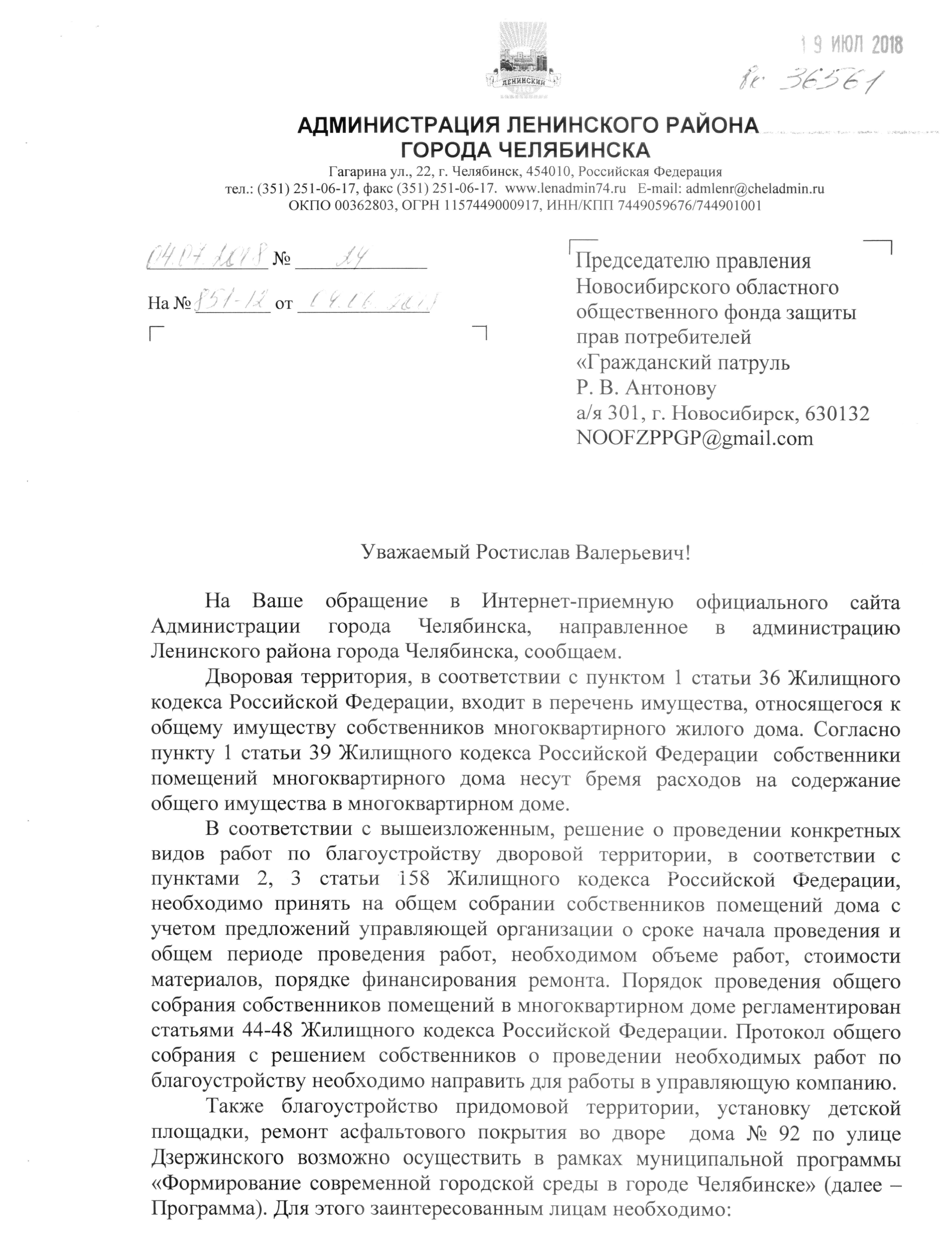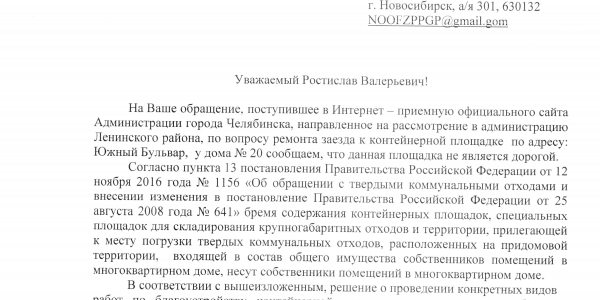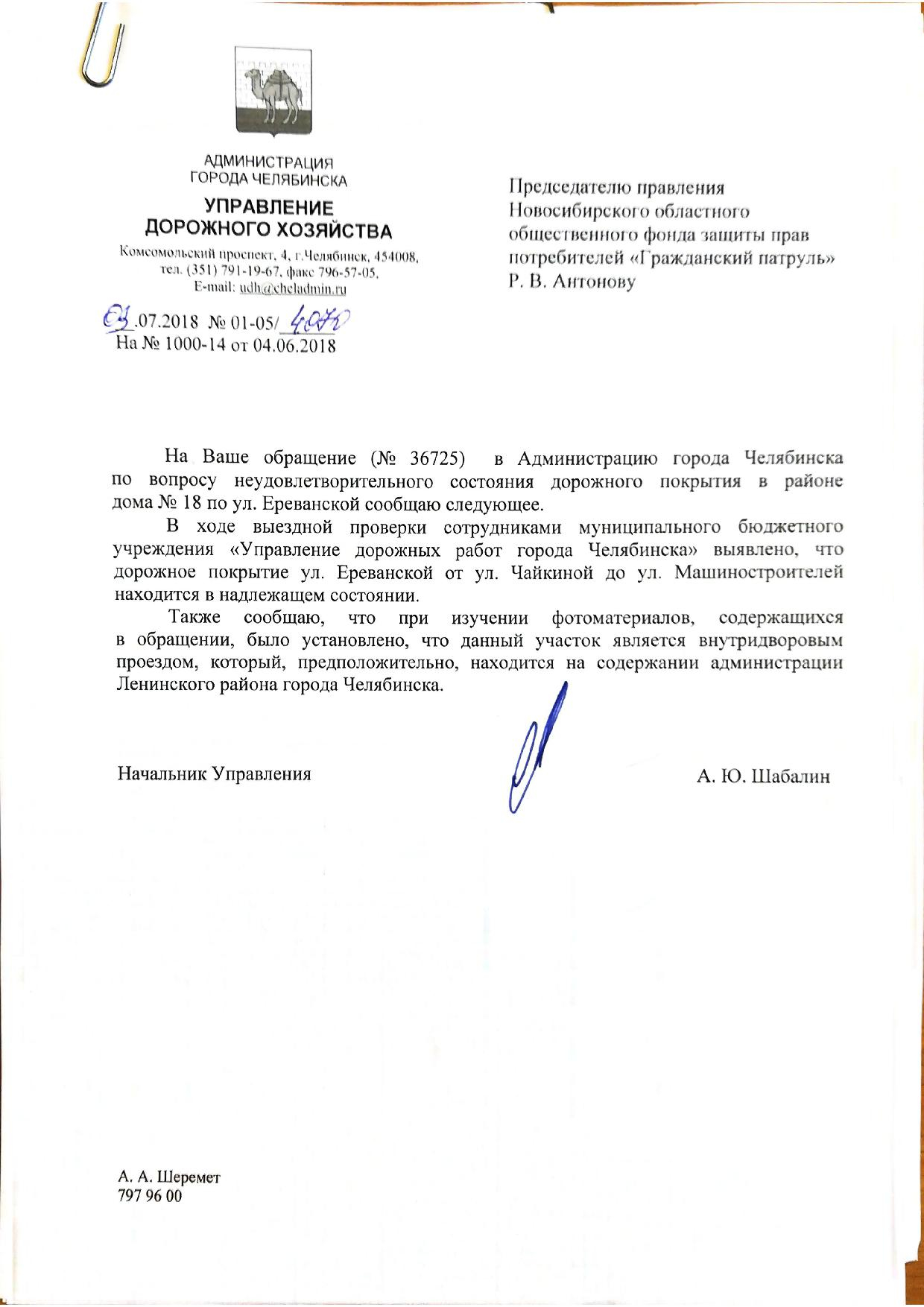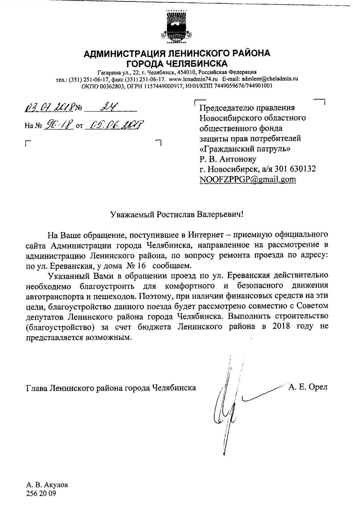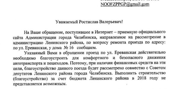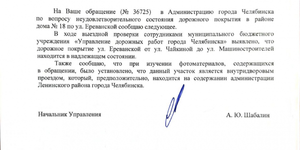 Номер жалобы:36725 Тип жалобы:Ямы во дворе Название объекта:Администрация Ленинского Района Города Челябинска Регион:Челябинская область Город:Челябинск Адрес:ул. Ереванская, 18 Описание жалобы:В указанном месте возле дома 18 по улице Ереванской многочисленные ямы в дороге, в которых убразуется большая лужа,что некомфортно как для пеших граждан района, так и для транспортных средств. Просим обновить асфальтовое покрытие в данном месте. Статус: