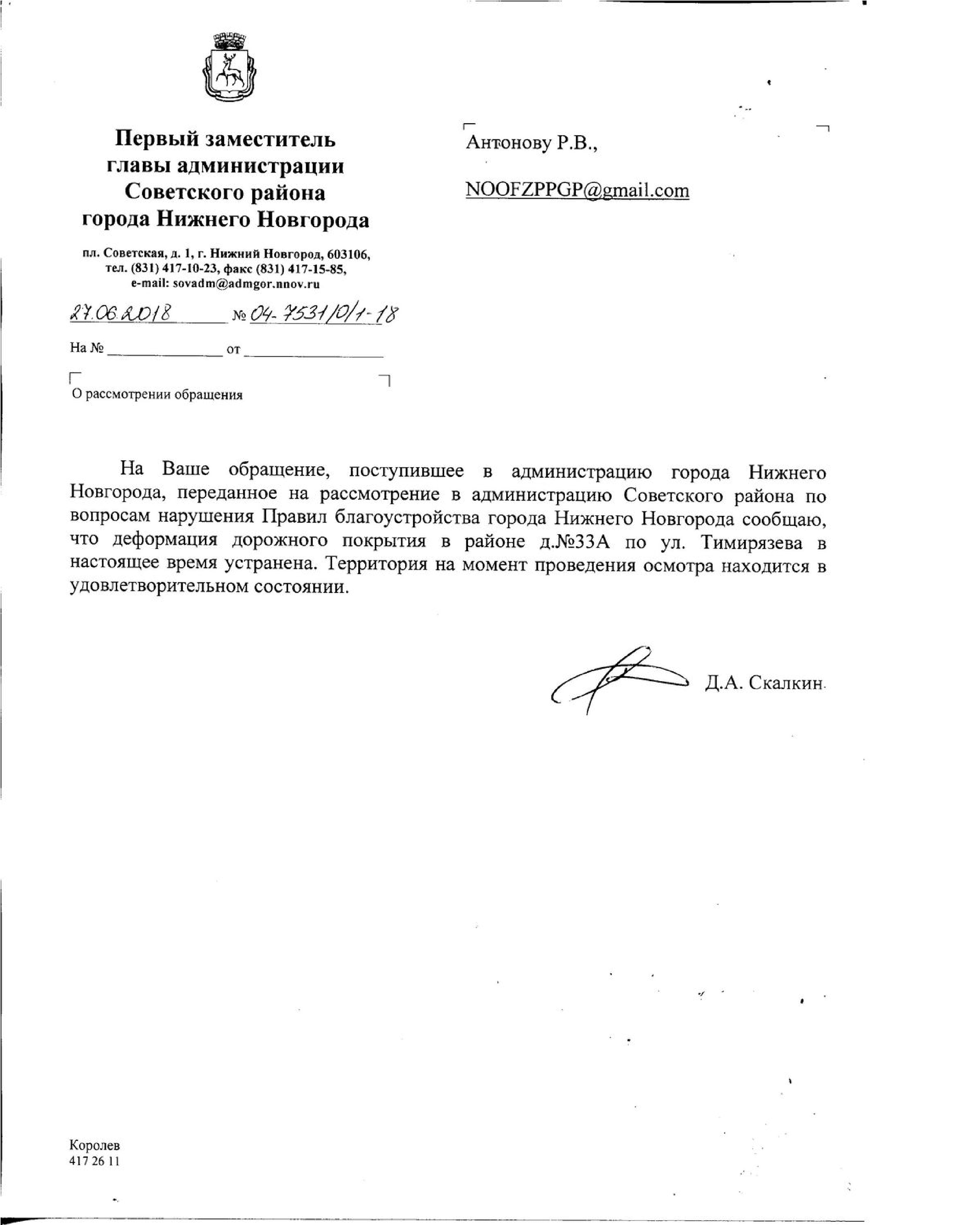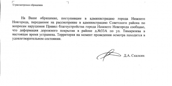Номер жалобы:36529 Тип жалобы:Ямы во дворе Название объекта:Администрация Советского района Регион:Нижегородская область Город:Нижний Новгород Адрес:Тимирязева 33 а Описание жалобы:Глубокая яма во дворе. Место где стояли мусорные контейнеры не привели в порядок. Статус:
