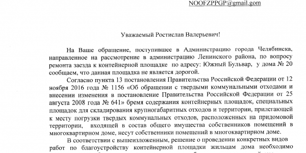 Номер жалобы:36446 Тип жалобы:Ямы во дворе Название объекта:Администрация Ленинского Района Города Челябинска Регион:Челябинская область Город:Челябинск Адрес:ул. Южный Бульвар, 20 Описание жалобы:1527-4 Возле дома номер 20 по улице Южный Бульвар, напротив мусорного бака многочисленные ямы. Здесь образуются лужи и грязь, которую по окрестности разносят машины. Просим заасфальтировать указанный отрезок. Статус: