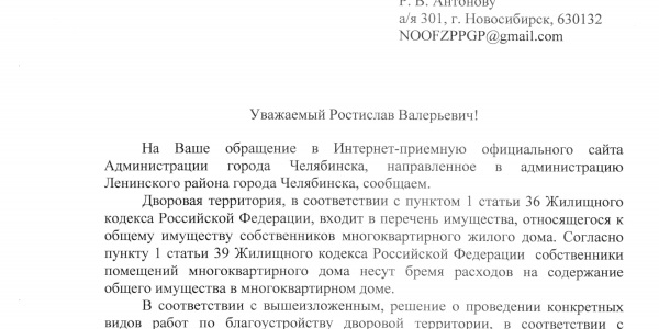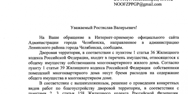Номер жалобы:36728 Тип жалобы:Ямы во дворе Название объекта:Администрация Ленинского Района Города Челябинска Регион:Челябинская область Город:Челябинск Адрес:ул. Суркова, 23 Описание жалобы:1001-14 Напротив дома 23 по улице Суркова многочисленные ямы, образовалась грязь, в которую паркуются машины, а затем разносят её по всей территории двора. Просим благоустроить данный участок дороги с сохранением зеленых насаждений для комфортной жизни гостей и жителей двора. Статус: