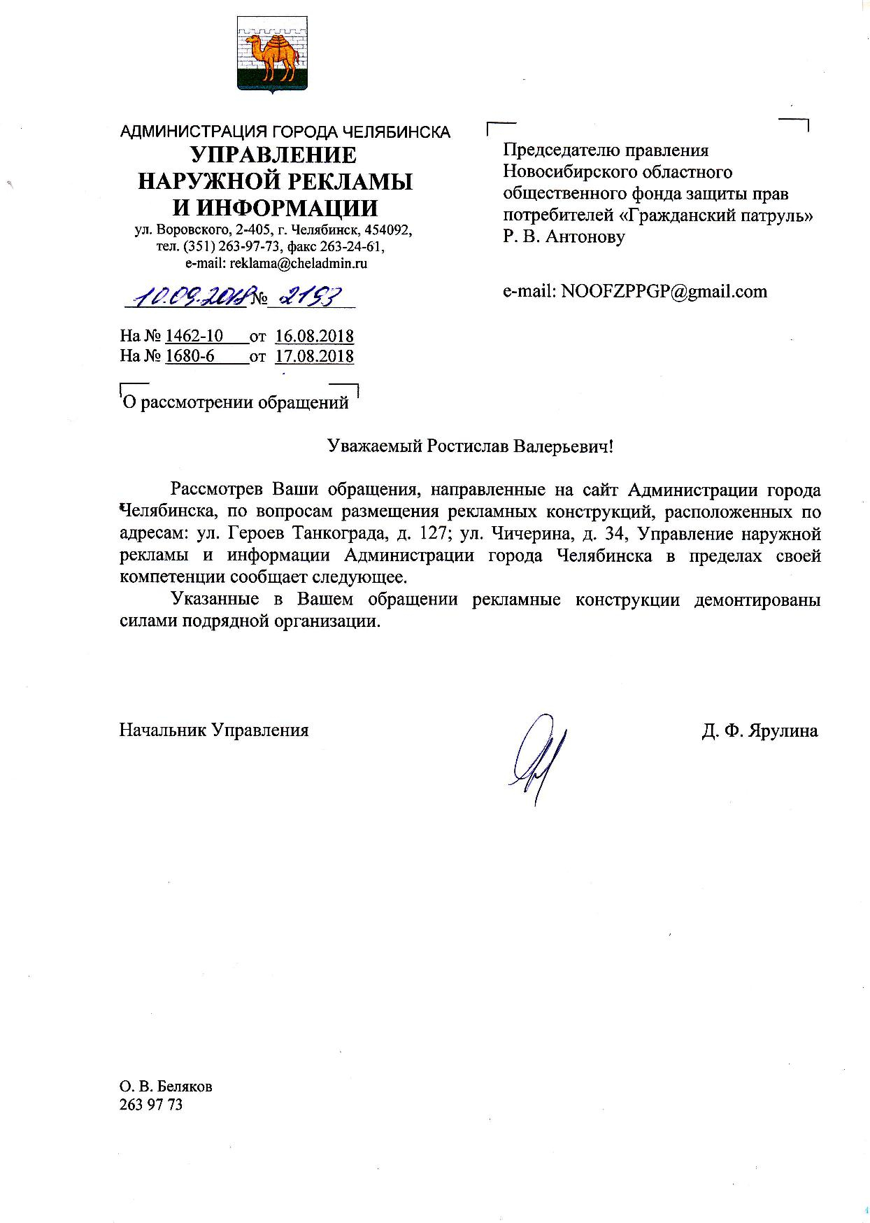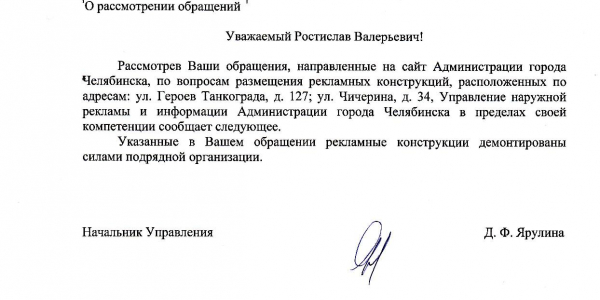 Номер жалобы:39909 Тип жалобы:Прочее Название объекта:Управление по рекламе Регион:Челябинская область Город:Челябинск Адрес:ул. Чичерина, 34 Описание жалобы:Прошу проверить законность установки рекламного стенда, расположенного на газоне между Чичерина, 36 и Чичерина, 34 Статус: