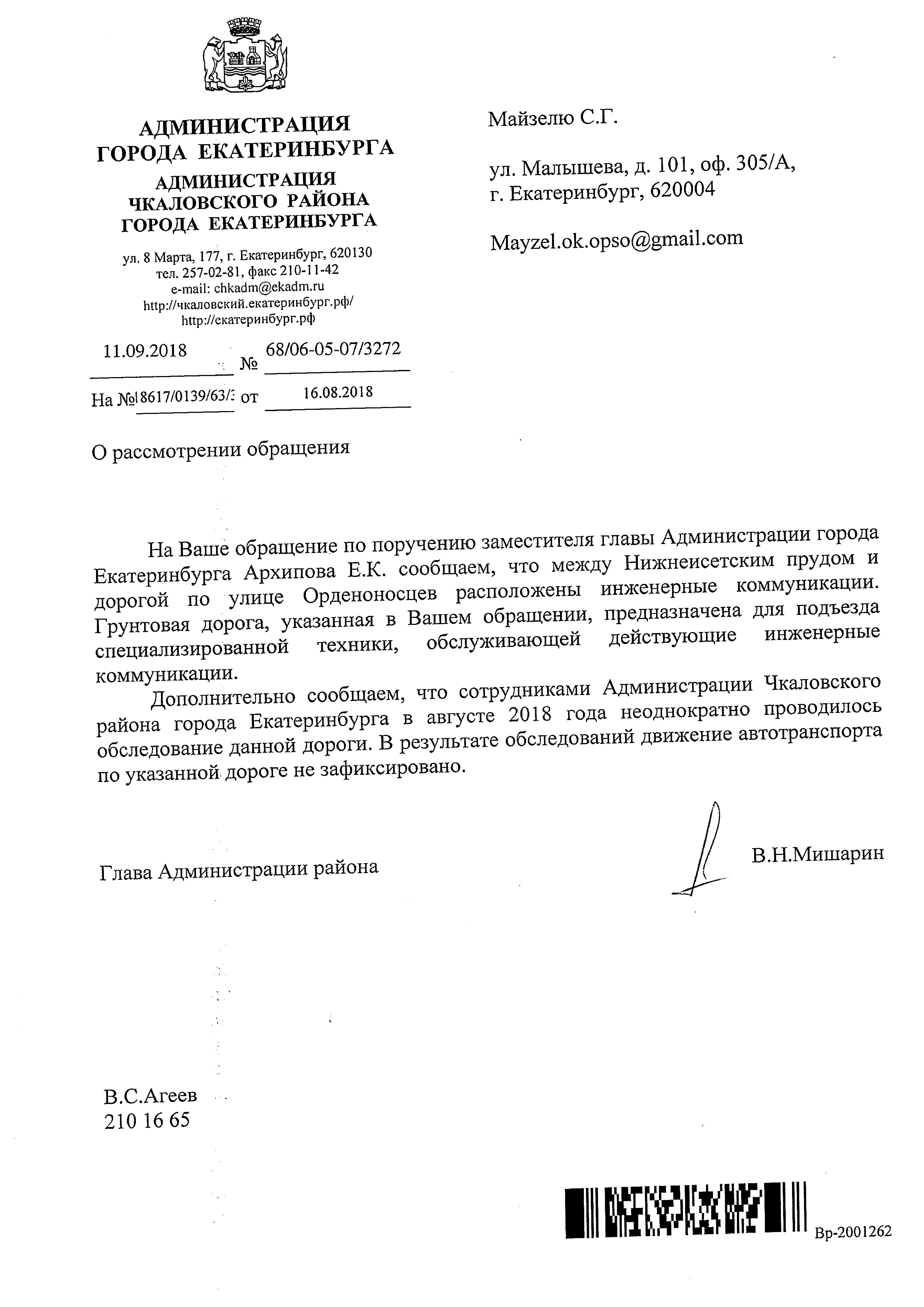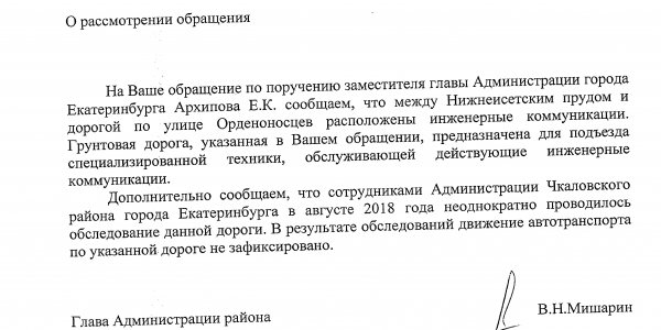 Номер жалобы:39851 Тип жалобы:Прочее Название объекта:Министерство природных ресурсов Свердловской области Регион:Свердловская область Город:Екатеринбург Адрес:улица Орденоносцев, 4, 6 Описание жалобы:В нарушение ст. 65 Водного кодекса РФ в водоохранной зоне Нижнеисетского пруда осуществляется движение автотранспорта вне автомобильных дорог. Проверка, проведённая по жалобе 38159 администрацией Екатеринбурга, не обнаружила несанкционированную дорогу. Заезд в водоохранную зону осуществляется в районе дома 1 по улице Орденоносцев, далее автомобили движутся под откосом насыпи улицы Орденоносцев в районе домов 4 и 6 на расстоянии 5–15 м от берега пруда. На всём протяжении имеется накатанная по газону колея. Статус: