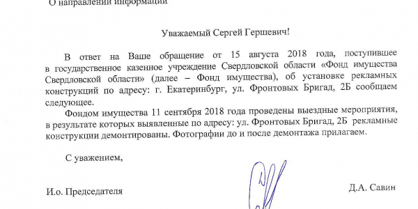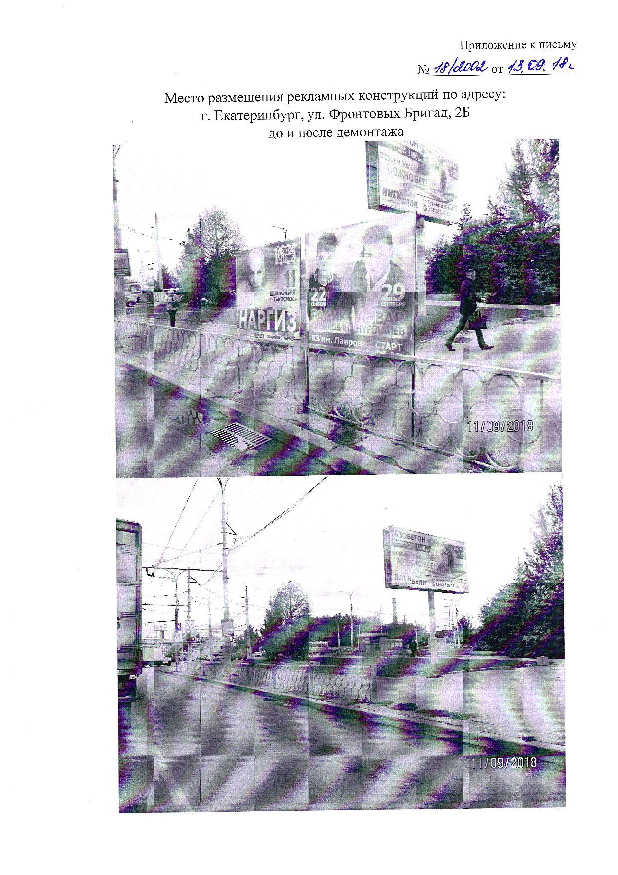Номер жалобы:39931 Тип жалобы:Прочее Название объекта:Администрация г.Екатеринбурга Регион:Свердловская область Город:Екатеринбург Адрес:ул. Фронтовых Бригад, 2б Описание жалобы:Незаконный афишный стенд возле входа в метро "Машиностроителей" . Консрукция закреплена к дорожному ограждению проволокой, что создаёт опасность травмирования пешеходов. Статус:
