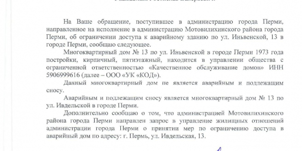 Номер жалобы:39804 Тип жалобы:Прочее Название объекта:Заброшенный Дом Регион:Пермский край Город:Пермь Адрес:ул. Иньвенская, 13 Описание жалобы:Заброшенный дом, многоквартирный, постоянно поджигают несовершеннолетние,пустует уже много лет Статус: