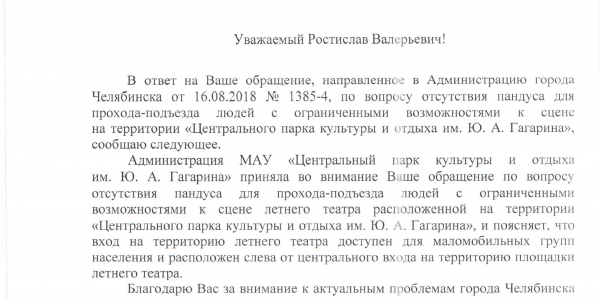 Номер жалобы:39877 Тип жалобы:Прочее Название объекта:Незнаю Регион:Челябинская область Город:Челябинск Адрес:ул. Коммуны, 122/1 Описание жалобы:Нет пандусов при подходе к сцене в Гагарина. Маломобильным гражданам и мамам с колясками никак не попасть к сцене. Статус: