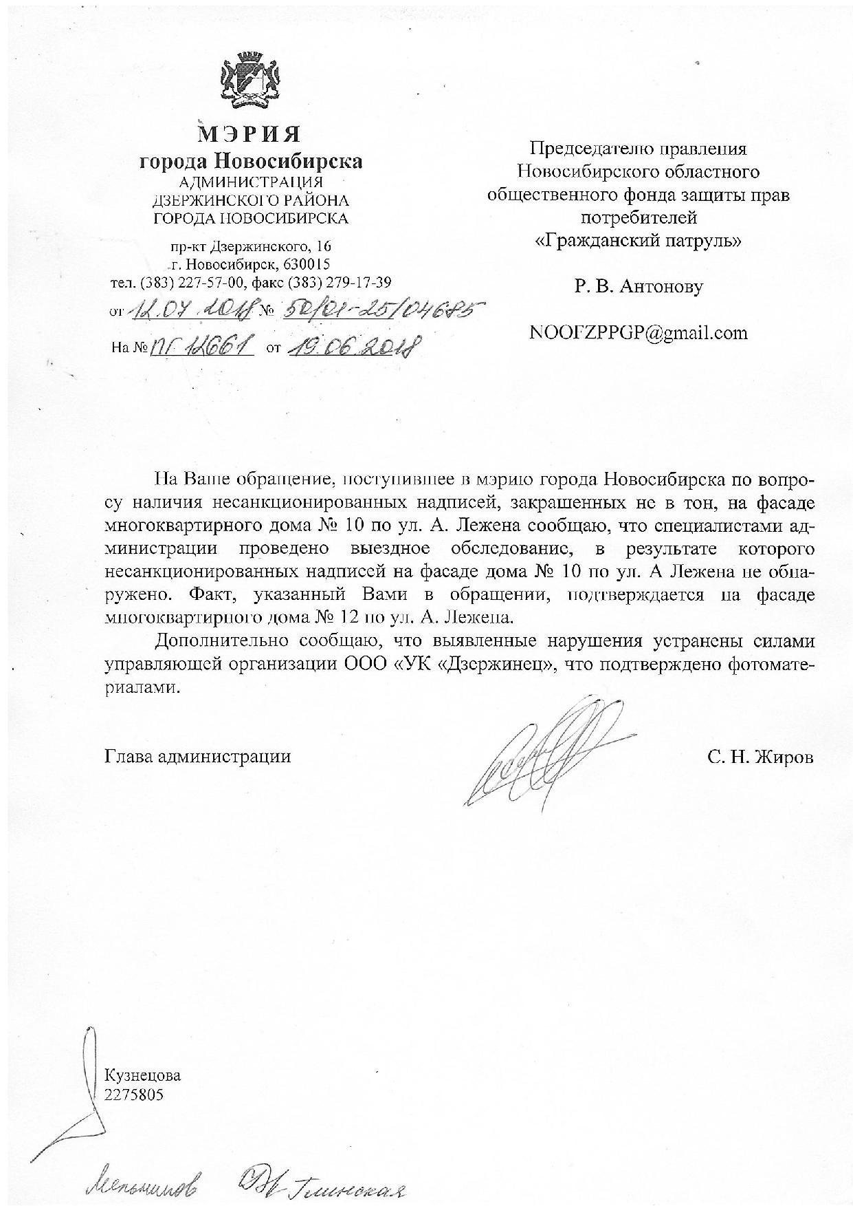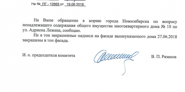Номер жалобы:35960 Тип жалобы:Иные проблемы ЖКХ Название объекта:Управляющая Компания Регион:Новосибирская область Город:Новосибирск Адрес:ул. Адриена Лежена, 12 Описание жалобы:Надписи закрашены не в тон Статус: