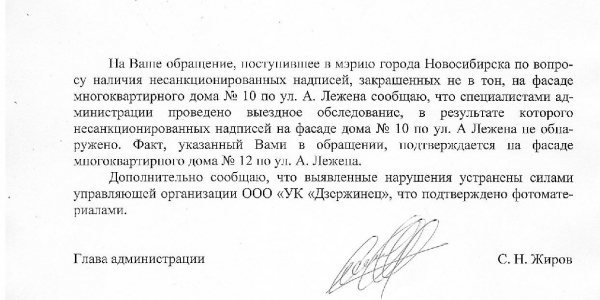 Номер жалобы:35950 Тип жалобы:Иные проблемы ЖКХ Название объекта:Управляющая Компания Регион:Новосибирская область Город:Новосибирск Адрес:ул. Адриена Лежена, 10/1 Описание жалобы:Надписи на фасаде дома Статус: