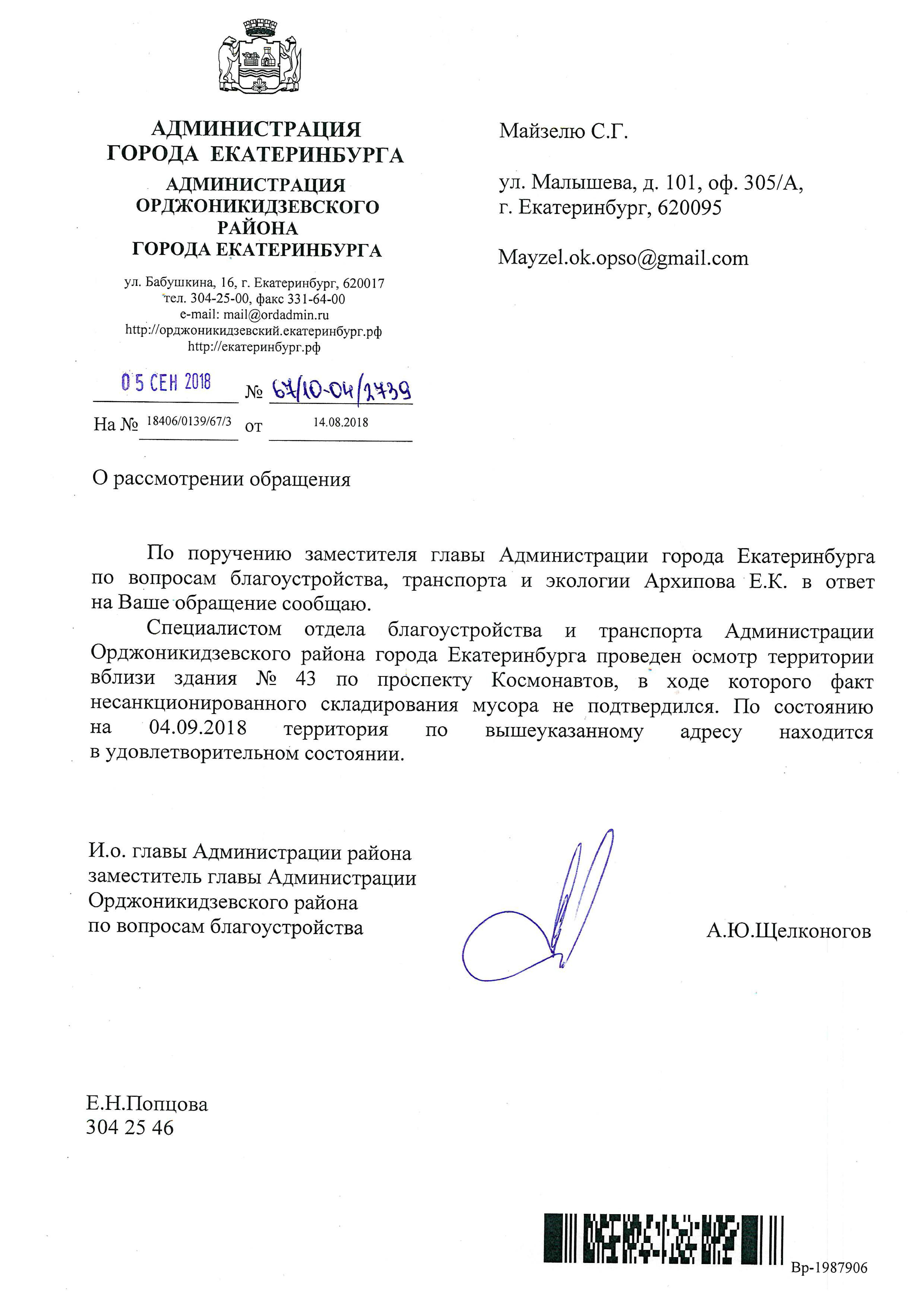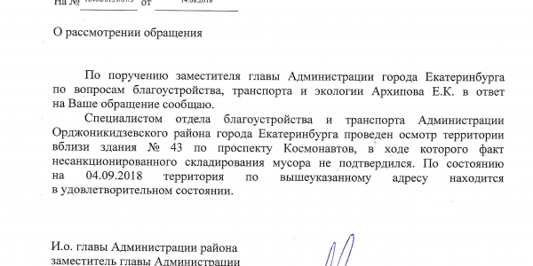 Номер жалобы:39632 Тип жалобы:Прочее Название объекта:не убирается мусор рядом с торговой точкой Регион:Свердловская область Город:Екатеринбург Адрес:пр. Космонавтов, 43 Описание жалобы:не убран мусор, антисанитария Статус:
