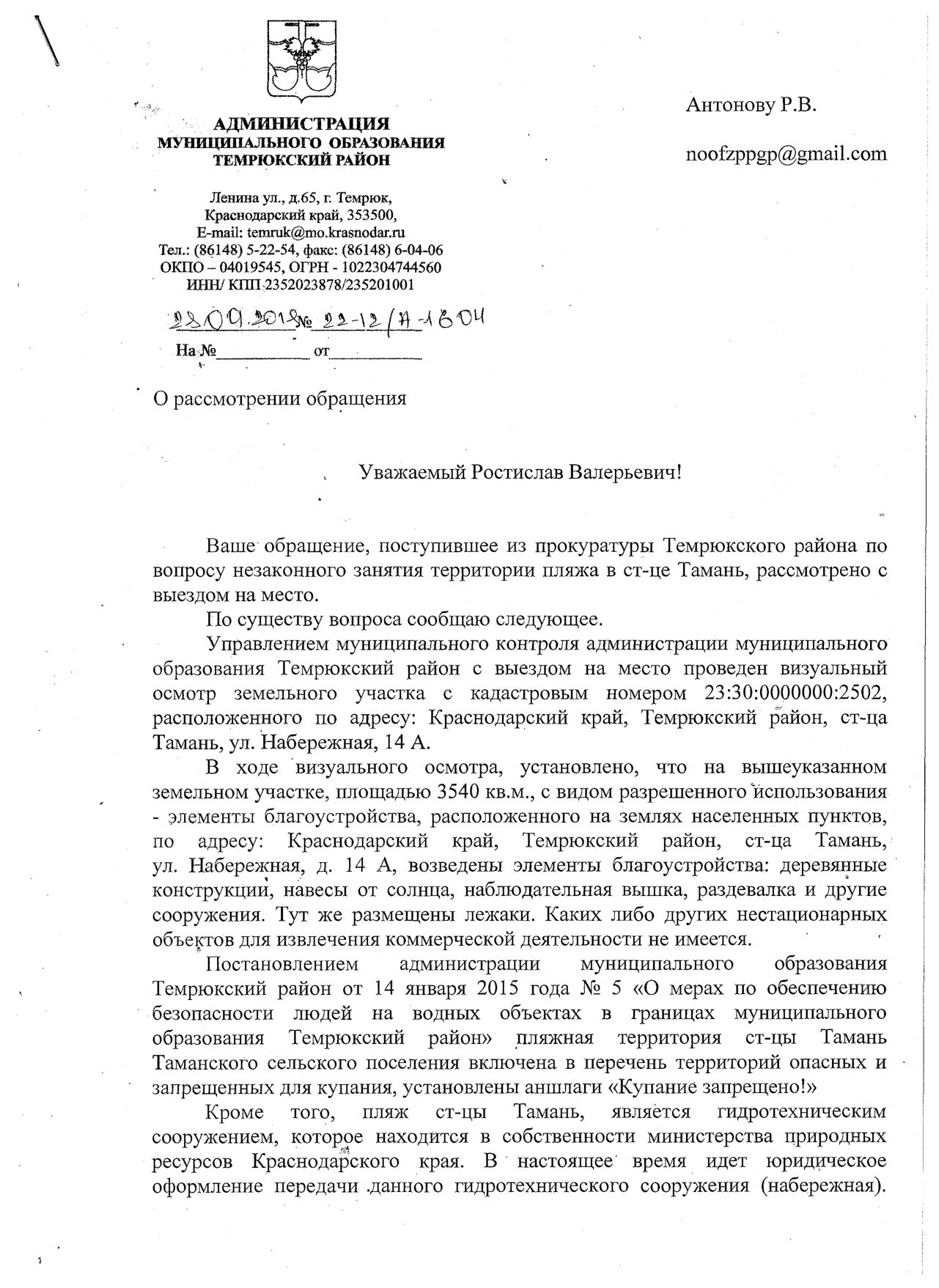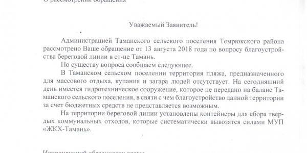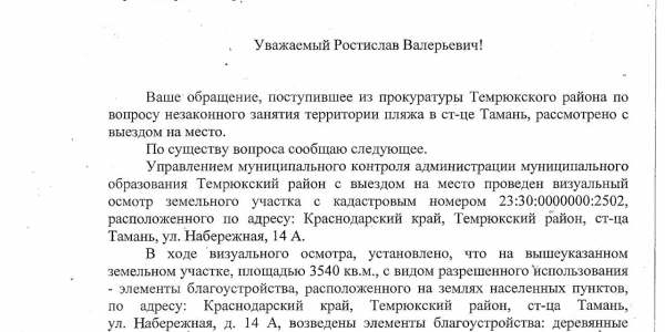 Номер жалобы:39653 Тип жалобы:Прочее Название объекта:Городской Пляж Город:Тамань Адрес:Тамань, Улица Прониной, 5 Описание жалобы:Самострой в виде навесов от солнца на пляже. Предполагаю что они установлены темИ кто сдаёт лежаки в прокат. С одной стороны спасибо, а с другой земля НЕ ПРИНАДЛЕЖИТ СУНИЦИПАЛИТЕТУ, соответственно за аренду пляжа и содержание никто не отвечает, услуги и конструкции небезопасны, бюджет недополучает денег от неполученный платы за аренду. Прошу администрацию сдать пляж в аренду с приведением его в состояние отвечающие всем требованиям и регламентам. Установить туалеты, душевые, обеспечить приборку на пляже. Ограничить въезд автомобилей к морю. Сделать дорожки. Статус: