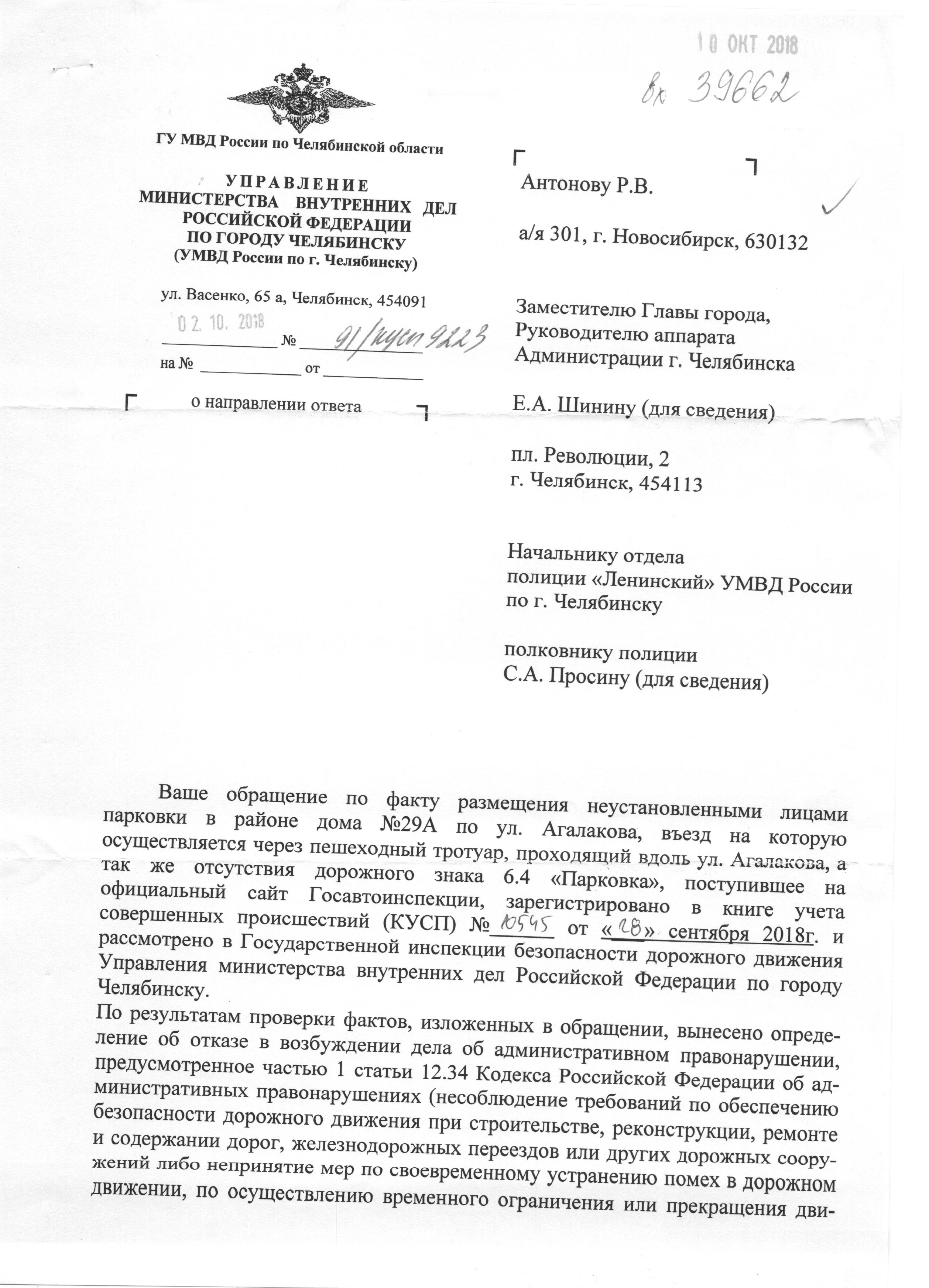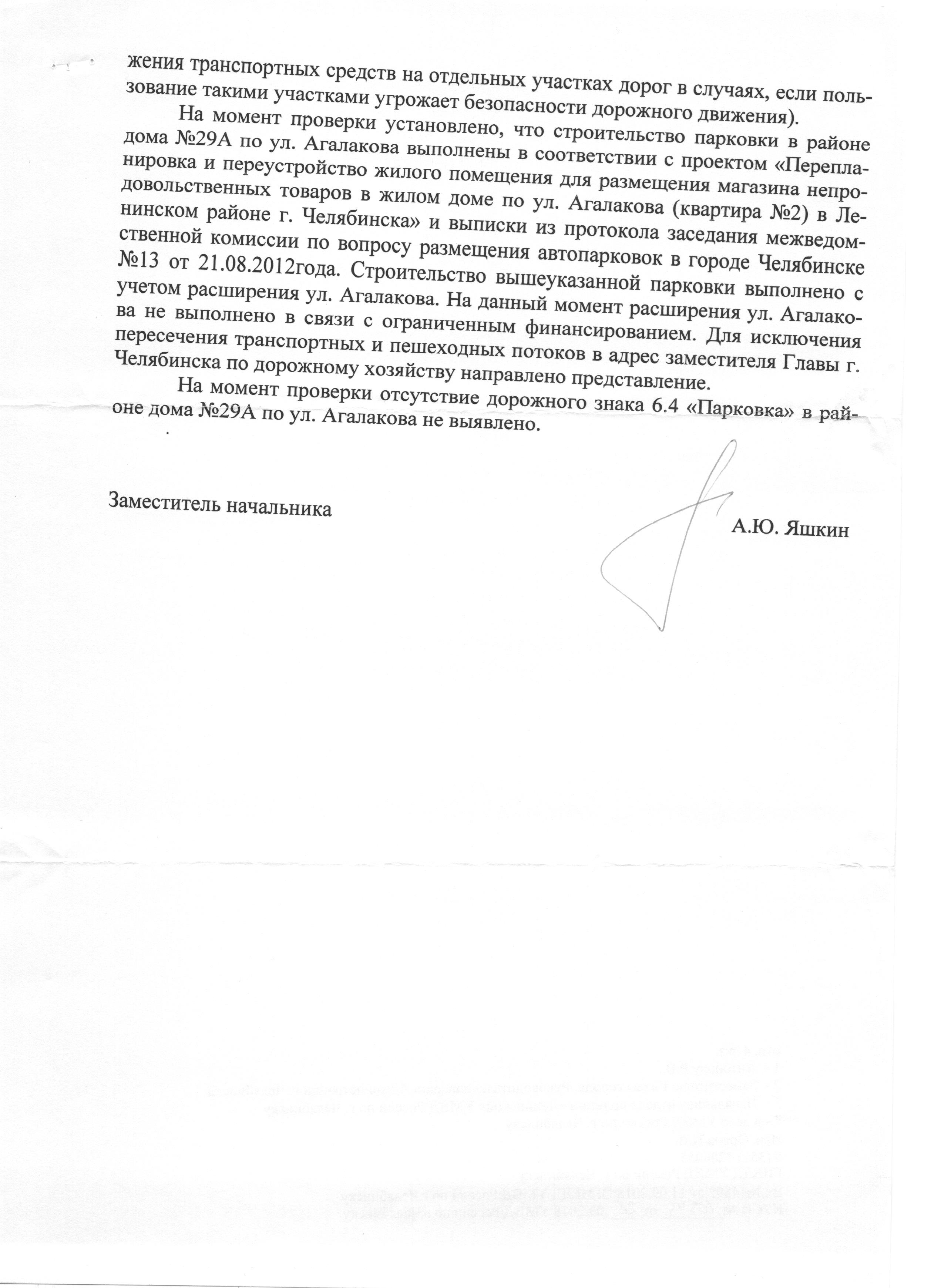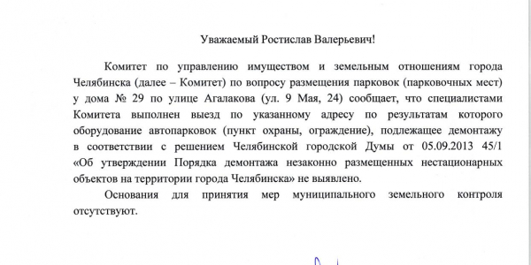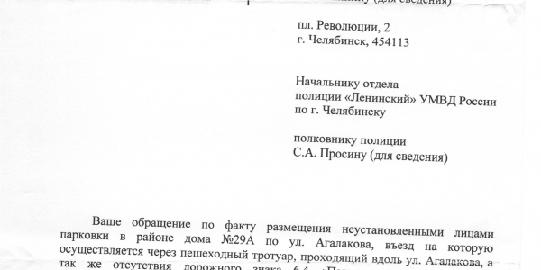 Номер жалобы:39662 Тип жалобы:Прочее Название объекта:Администрация Ленинского района Регион:Челябинская область Город:Челябинск Адрес:ул. Агалакова, 29А Описание жалобы:1660-8 На данном участке тротуара(!) около года назад неизвестно кем была создана "парковка". Въезд осуществляется через тротуар, что угрожает безопасности пешеходов. Знак "Парковка" отсутствует. Статус: